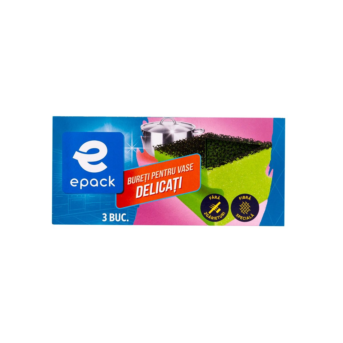Buretii delicati Epack, prevazuti cu caneluri, sunt destinati pentru spalarea si curatarea vaselor si a altor suprafete din bucatarie, fiind realizati dintr-o fibra speciala ce nu lasa zgaraieturi in urma utilizarii. Acestia au culoarea verde + negru, iar setul contine 3 bucati.