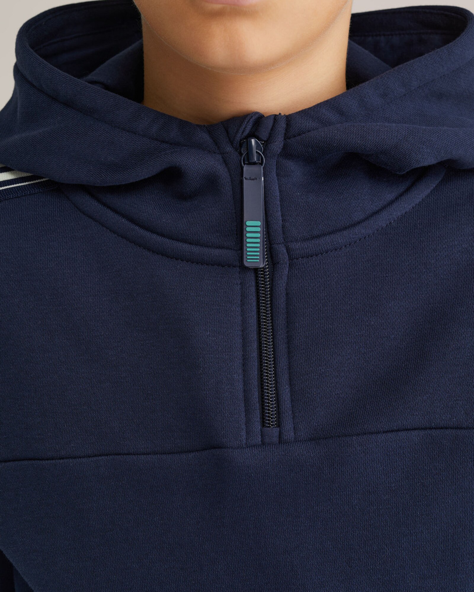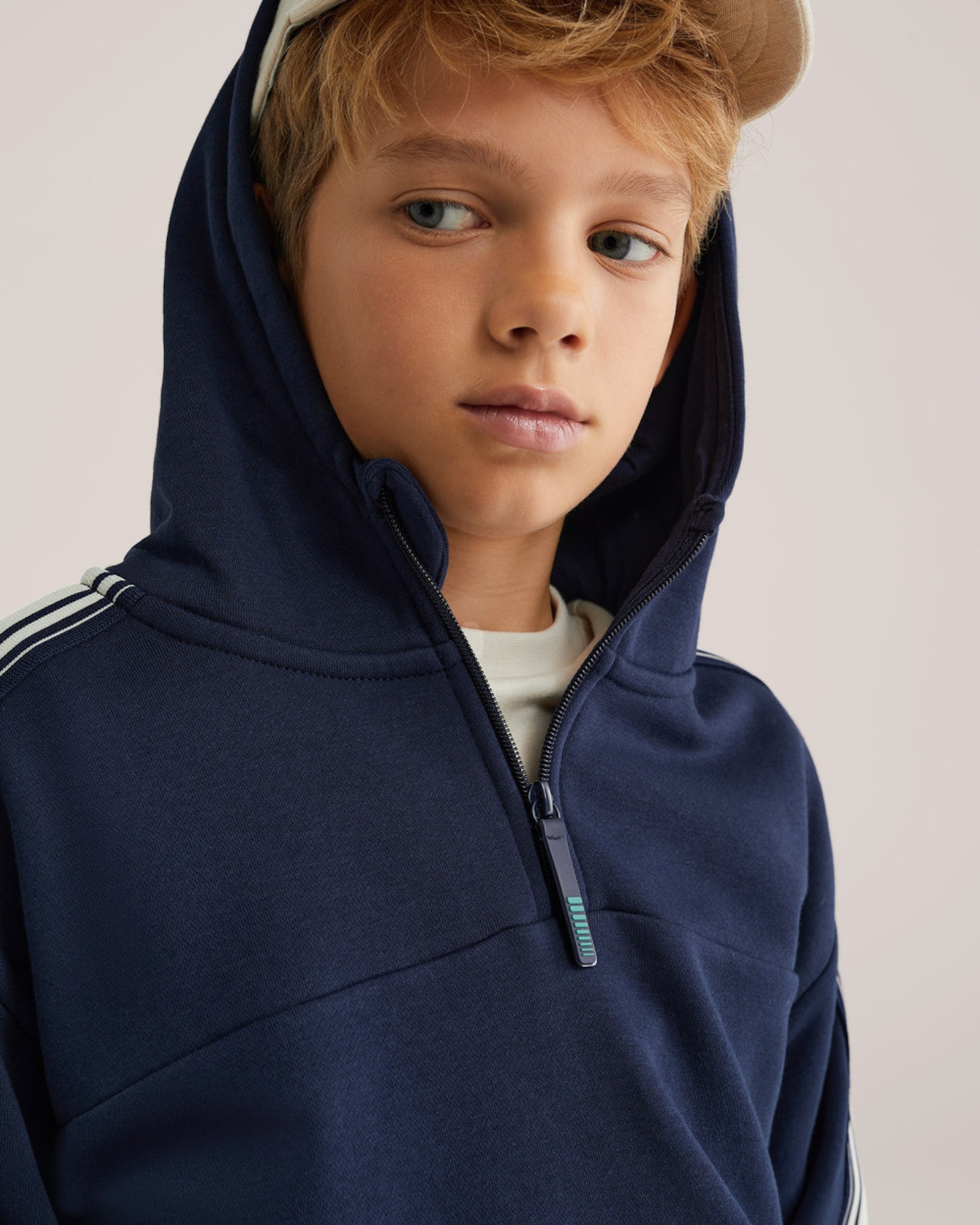 Design: Guler tunică cu glugă, Manșete cu striații, Dungi laterale, Semifermoar; Tip de închidere: Fermoar; Material: Material sweat; Decolteu: Cu glugă; Imprimeu: Cu logo imprimat; Detalii: Cusături ton în ton, Material moale; Croi: Croi normal; Lungime mâneci: Mâncecă lungă