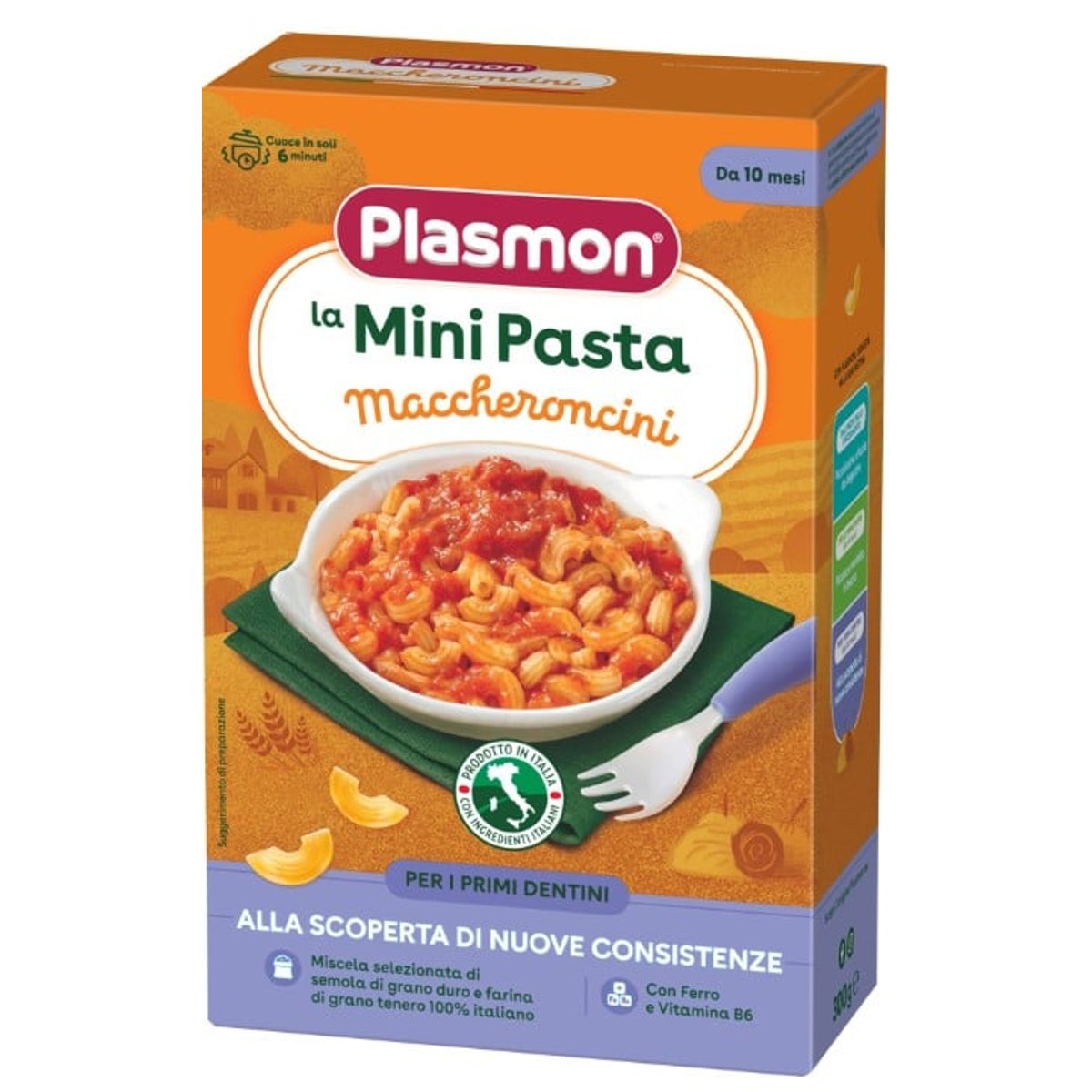 Sunt obtinute dintr-un aluat special de grau moale si grau dur, create pt a face cat mai usor trecerea de la pastele foarte mici si moi la cele de dimensiuni putin mai mari, astfel incat sa incurajeze masticatia.Produsul este obtinut din faini selectionate si bine controlate,din grau cultivat dupa regulile Oasia®Plasmon, in cele mai bune conditii si pe terenuri selectionate, departe de surse de poluare.Cerealele sunt pastrate fara utilizarea niciunui pesticid dupa recoltare lor. Se recomanda pe perioada diversificarii, pentru a incuraja masticatia; sunt imbogatite cu calciu, fier si vitamine esentiale pentru o crestere echilibrata; sunt usor de digerat datorita fainii de grau diastazica, fiind supuse unui proces tehnologic special. .Modalitati de preparare - se fierb cu 500 ml de apa , se toarna 2/3 linguri de paste Plasmon, se lasa la fiert cca 5 minute si apoi se scurge, adaugand alte ingrediente de ex - sos de rosii, carne, branza, ulei de masline. Se pastreaza la loc uscat si ferit de caldura. Dozele pot varia in functiu de varsta si apetitul copilului. Contin - faina de grau (49,7%), grau dur (49.8%), minerale (calciu, fier), vitamine (B1, B2, B6, PP). Contin gluten. Pot contine urme de lupin,lapte si oua.A se pastra intr-un loc racoros si uscat, departe de sursele de caldura. A se consuma inainte de data inscrisa pe ambalaj.Conform instructiunilor de pe pachet