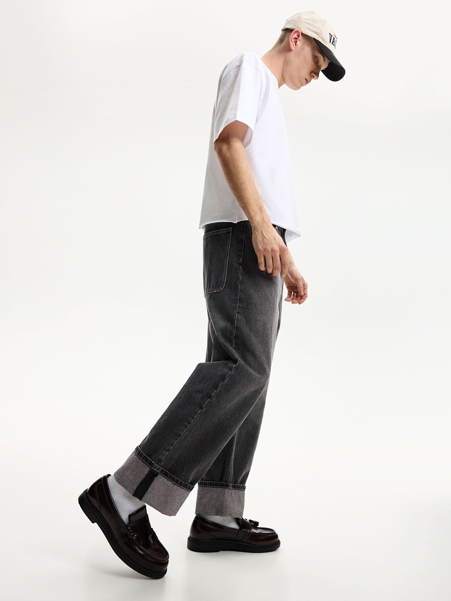 Design: Tiv răsfrânt, Închidere cu fermoar, Model cu 5 buzunare; Tip de închidere: Fermoar; Material: Denim; Imprimeu: Monocrom; Detalii: Cusături contrastante, Găici pentru curea; Culoare: Heavy washed; Lungimea: Lung/maxi; Tipul croiului: Largi