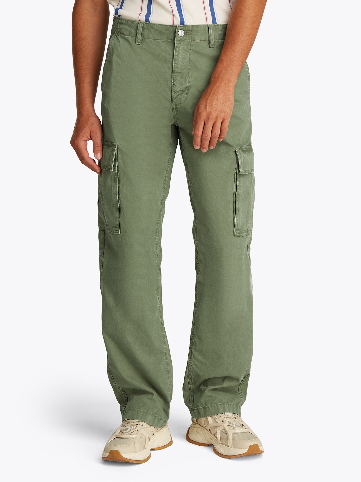 Design: Tiv/ betelie elastică, Fermoar ascuns, Buzunare cargo, Buzunar monede, Buzunare rabatabile, Buzunare laterale deschise, Închidere cu nasturi; Tip de închidere: Fermoar; Material: Bumbac; Imprimeu: Monocrom; Detalii: Logo brodat, Cusături ton în ton, Material moale, Găici pentru curea; Lungimea: Lung/maxi; Tipul croiului: Largi