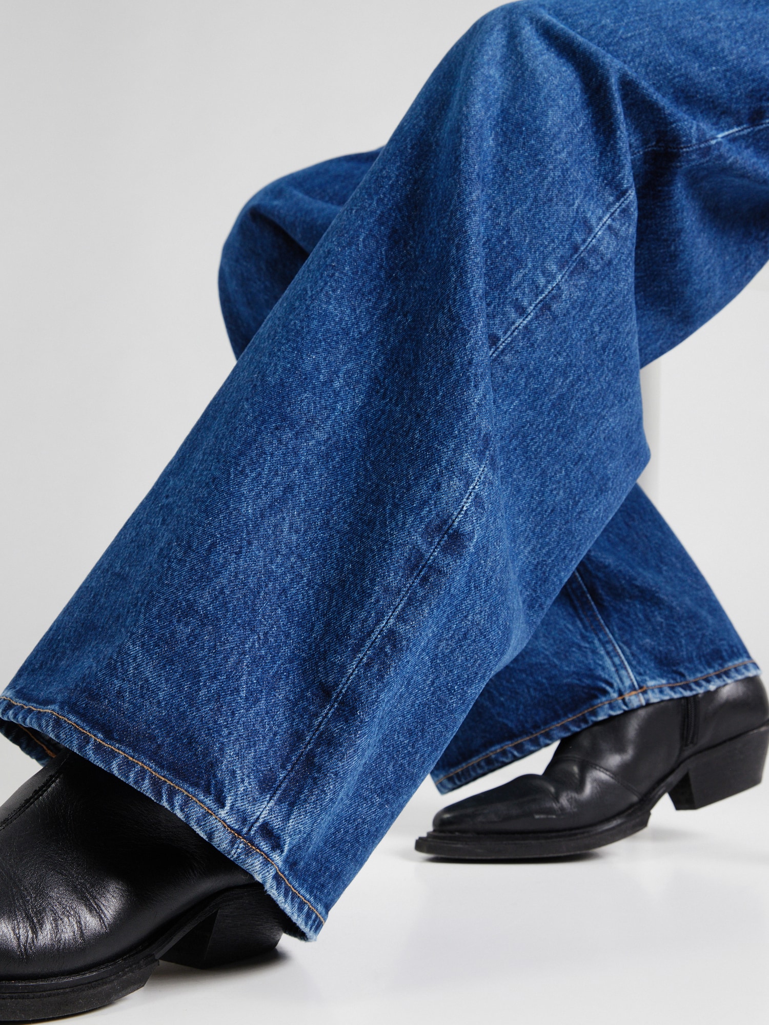 Design: Tiv/ margine tighelită, Model cu 5 buzunare; Tip de închidere: Închidere cu nasturi; Material: Denim; Imprimeu: Monocrom; Detalii: Pietricele decorative, Cusături contrastante, Material rigid, Găici pentru curea; Culoare: Denim albastru/ washed; Lungimea: Lung/maxi; Tipul croiului: Wide leg; Tipul taliei: Mid waist
