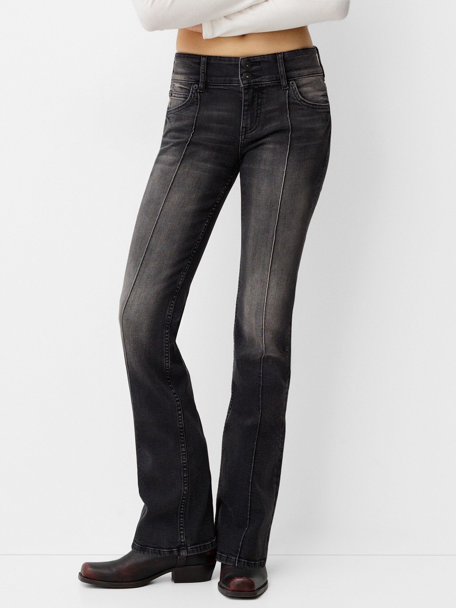 Design: Tiv/ margine tighelită, Cusături partiție, Închidere cu fermoar, Model cu 5 buzunare; Tip de închidere: Fermoar; Material: Denim; Imprimeu: Monocrom; Detalii: Cusături ton în ton, Efect prespălat, Material rigid, Găici pentru curea; Culoare: Rinsed/dark washed; Lungimea: Lung/maxi; Tipul croiului: Bootcut; Tipul taliei: Low waist