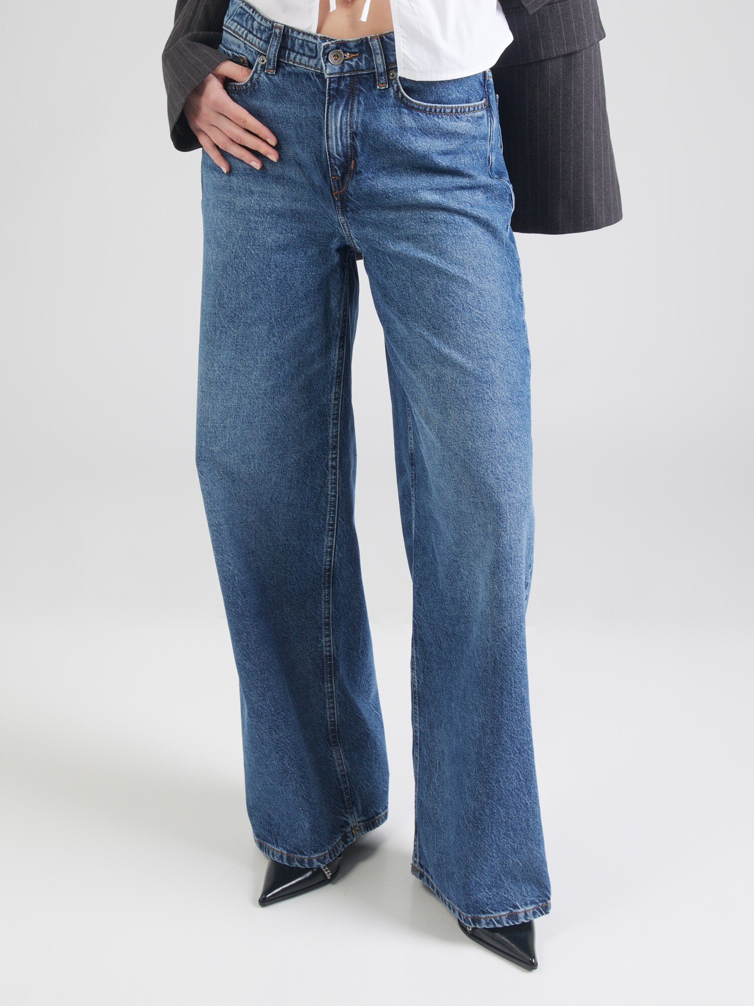 Design: Tiv/ margine tighelită, Închidere cu fermoar, Model cu 5 buzunare, Închidere cu nasturi; Tip de închidere: Fermoar; Material: Denim; Imprimeu: Monocrom; Detalii: Pietricele decorative, Cusături contrastante, Petic cu logo, Efect prespălat, Găici pentru curea; Culoare: Light washed; Lungimea: Lung/maxi; Tipul croiului: Wide leg; Tipul taliei: Mid waist