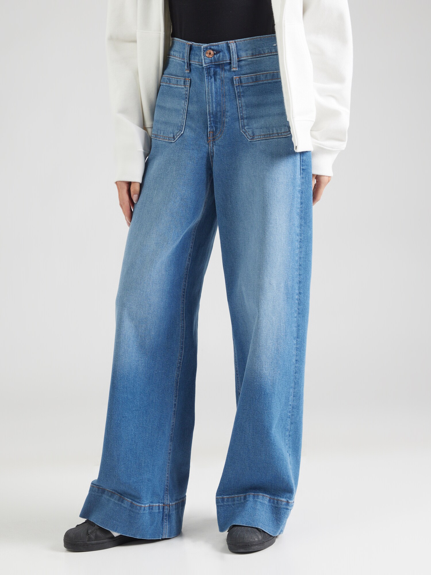 Design: Tiv/ margine tighelită, Închidere cu fermoar, Buzunare aplicate, Buzunare spate; Tip de închidere: Fermoar; Material: Denim; Imprimeu: Monocrom; Detalii: Cusături contrastante, Material rigid, Găici pentru curea; Culoare: Light washed; Lungimea: Lung/maxi; Tipul croiului: Wide leg; Tipul taliei: High waist
