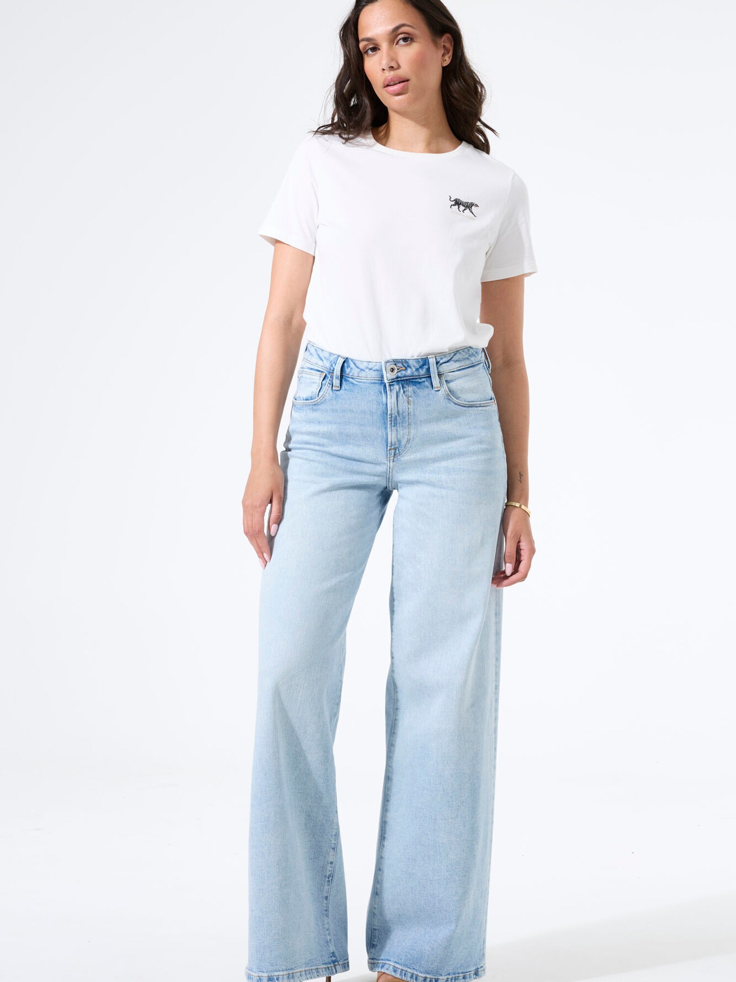 Design: Tiv/ margine tighelită, Închidere cu fermoar, Model cu 5 buzunare; Tip de închidere: Fermoar; Material: Denim; Imprimeu: Monocrom; Detalii: Cusături contrastante, Petic cu logo, Material rigid, Găici pentru curea; Culoare: Light washed; Lungimea: Lung/maxi; Tipul croiului: Wide leg; Tipul taliei: High waist