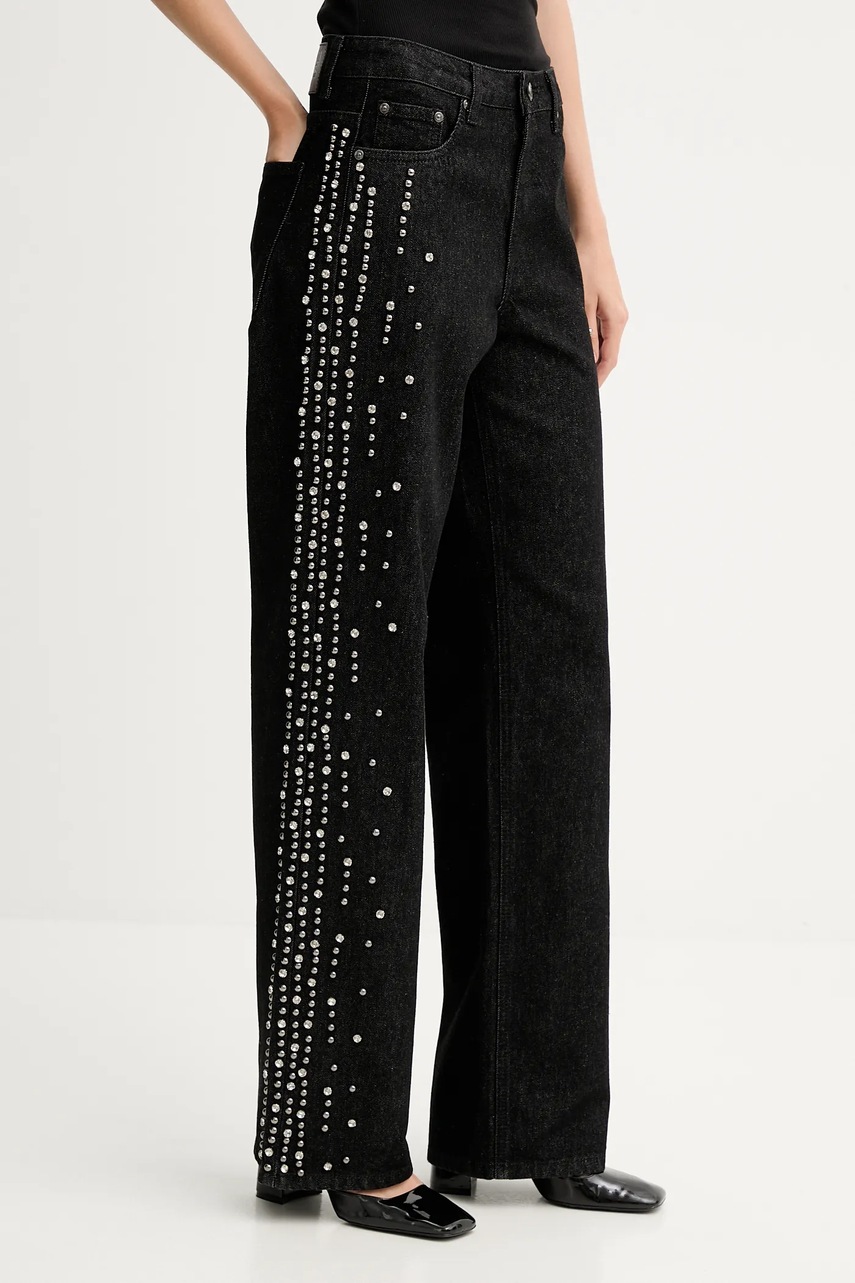 Jeansi din colectia Gestuz cu fason wide cu talia inalta. Model confectionat din denim cu aplicații decorative. Rigid, tinand cont de forma materialului.