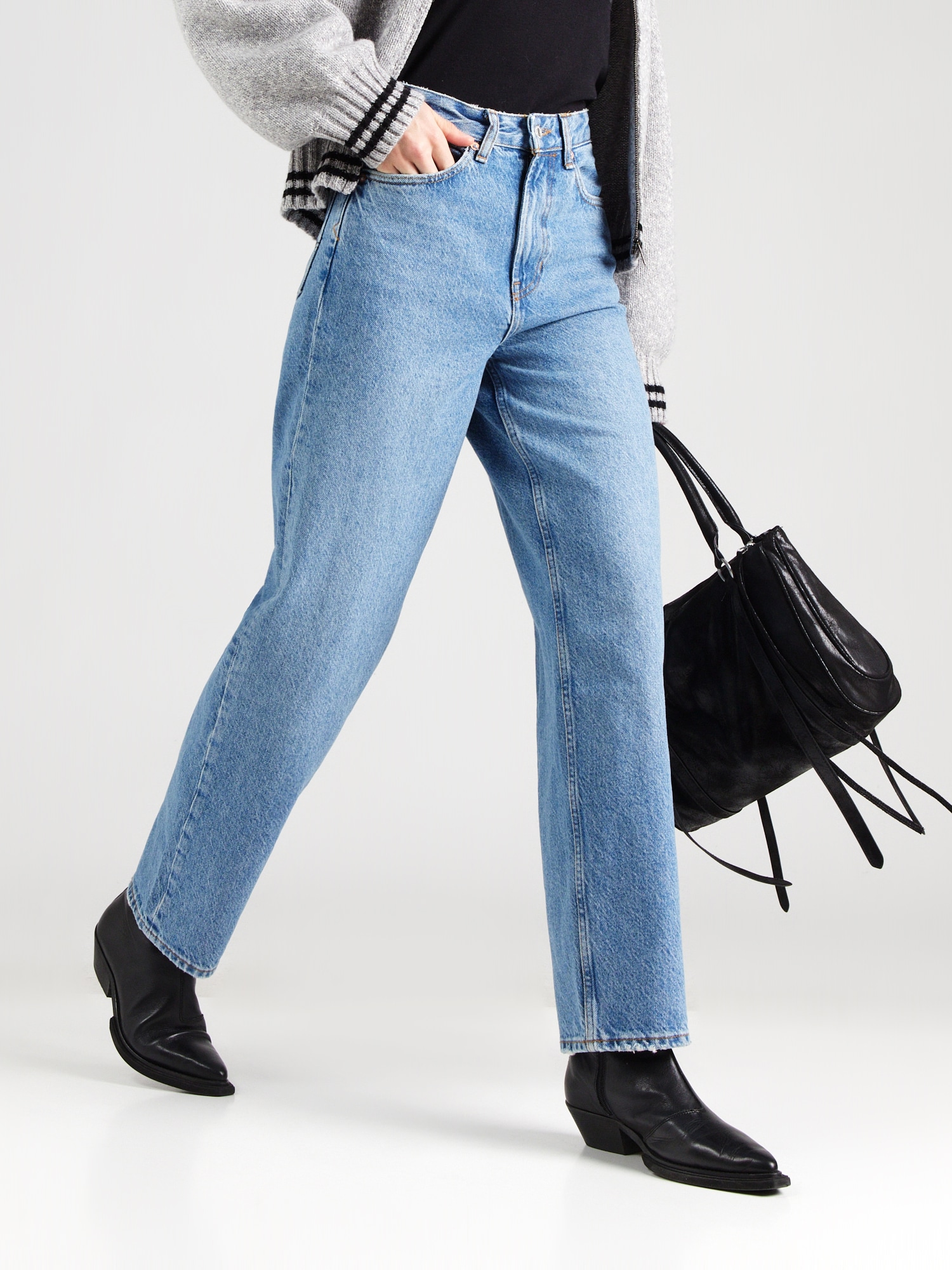 Design: Închidere cu fermoar, Model cu 5 buzunare; Tip de închidere: Fermoar; Material: Denim; Imprimeu: Monocrom; Detalii: Cusături contrastante, Găici pentru curea, Fabricat ecologic; Culoare: Denim albastru/ washed; Lungimea: Lung/maxi; Tipul croiului: Largi; Tipul taliei: High waist