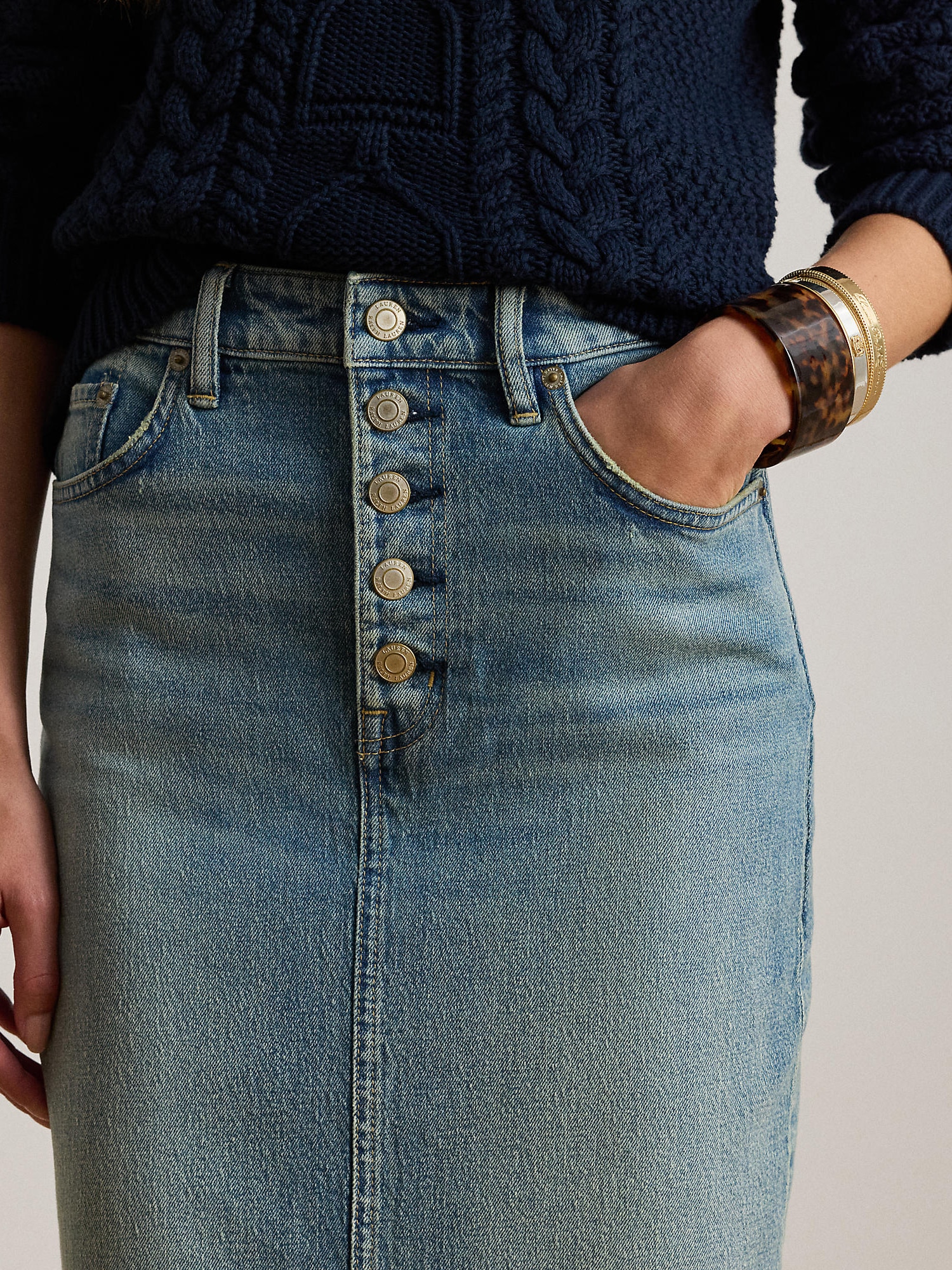 Design: Tiv/ margine tighelită, Șliț la spate, Model cu 5 buzunare; Tip de închidere: Închidere cu nasturi; Material: Denim; Imprimeu: Monocrom; Forma fustei: Creion; Detalii: Pietricele decorative, Cusături contrastante, Efect prespălat, Material rigid, Găici pentru curea; Lungimea: Lungime 3/4; Croi: Croi normal