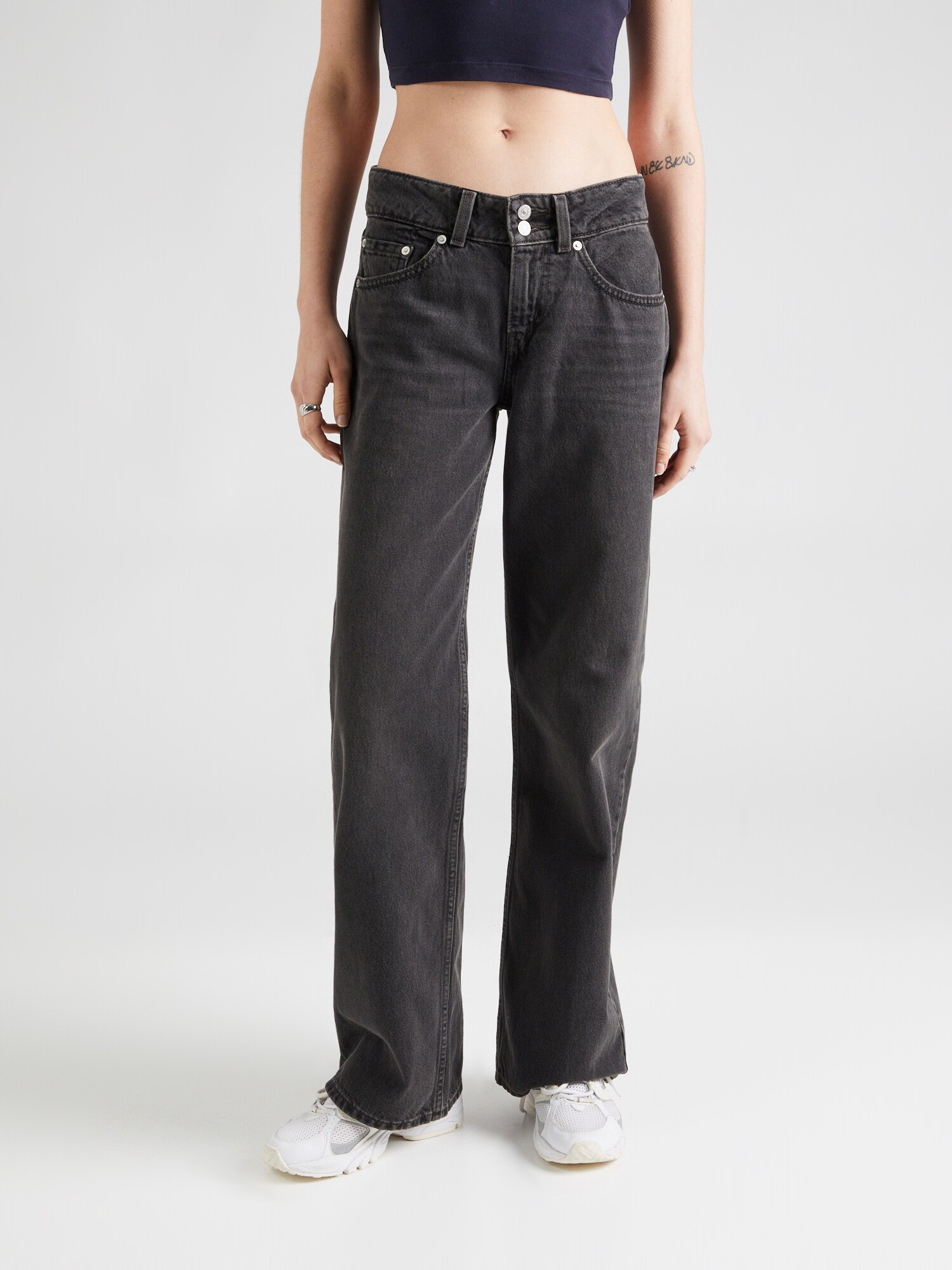 Design: Tiv/ margine tighelită, Închidere cu fermoar, Model cu 5 buzunare; Tip de închidere: Fermoar; Material: Denim; Imprimeu: Monocrom; Detalii: Pietricele decorative, Petic cu logo, Găici pentru curea; Culoare: Heavy washed; Lungimea: Lung/maxi; Tipul croiului: Regular; Tipul taliei: Low waist