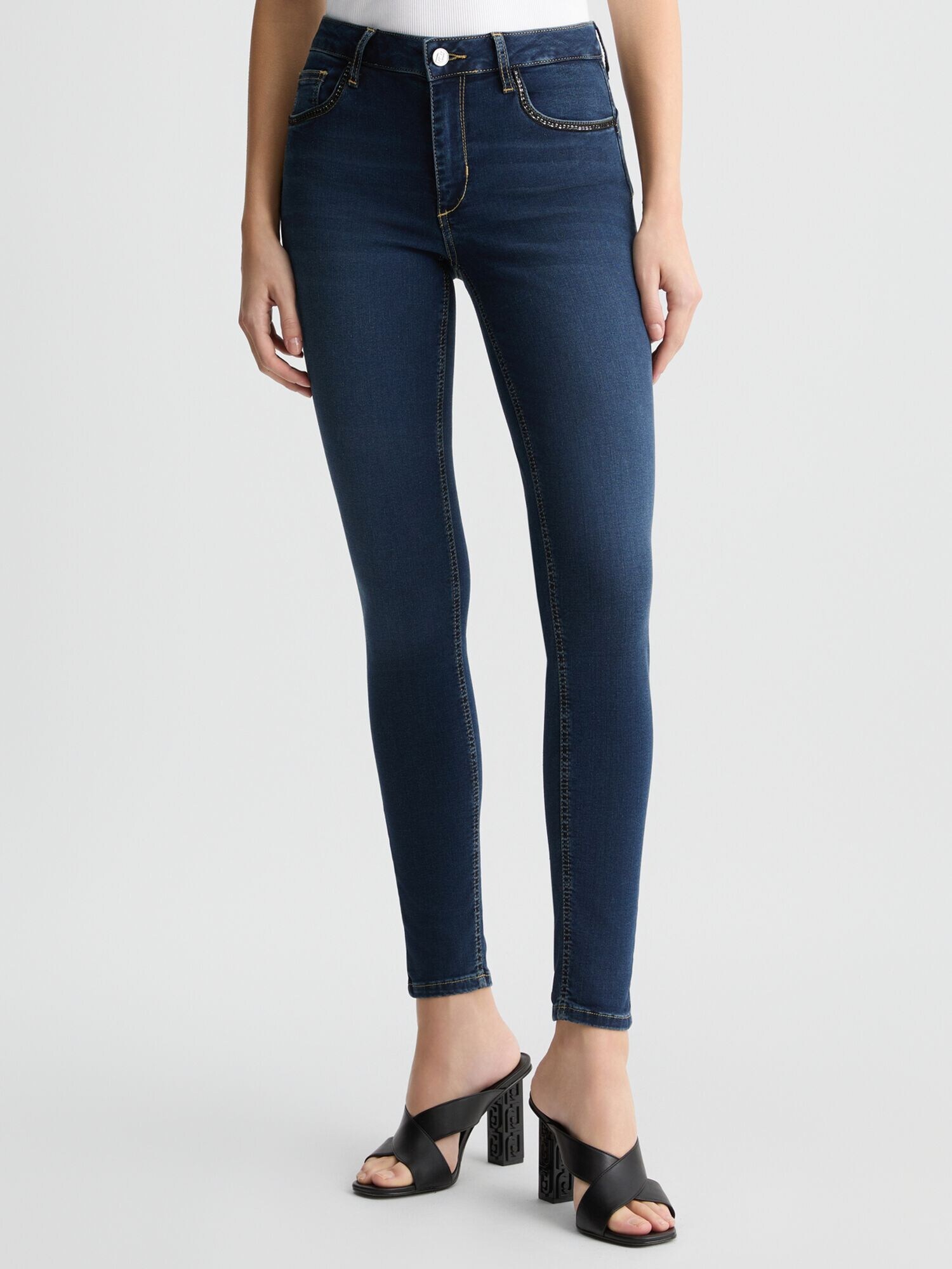 Design: Închidere cu fermoar, Model cu 5 buzunare; Tip de închidere: Fermoar; Material: Denim; Imprimeu: Monocrom; Detalii: Pietricele decorative, Cusături contrastante, Material rigid; Culoare: Rinsed/dark washed; Lungimea: Lung/maxi; Tipul croiului: Skinny; Tipul taliei: High waist
