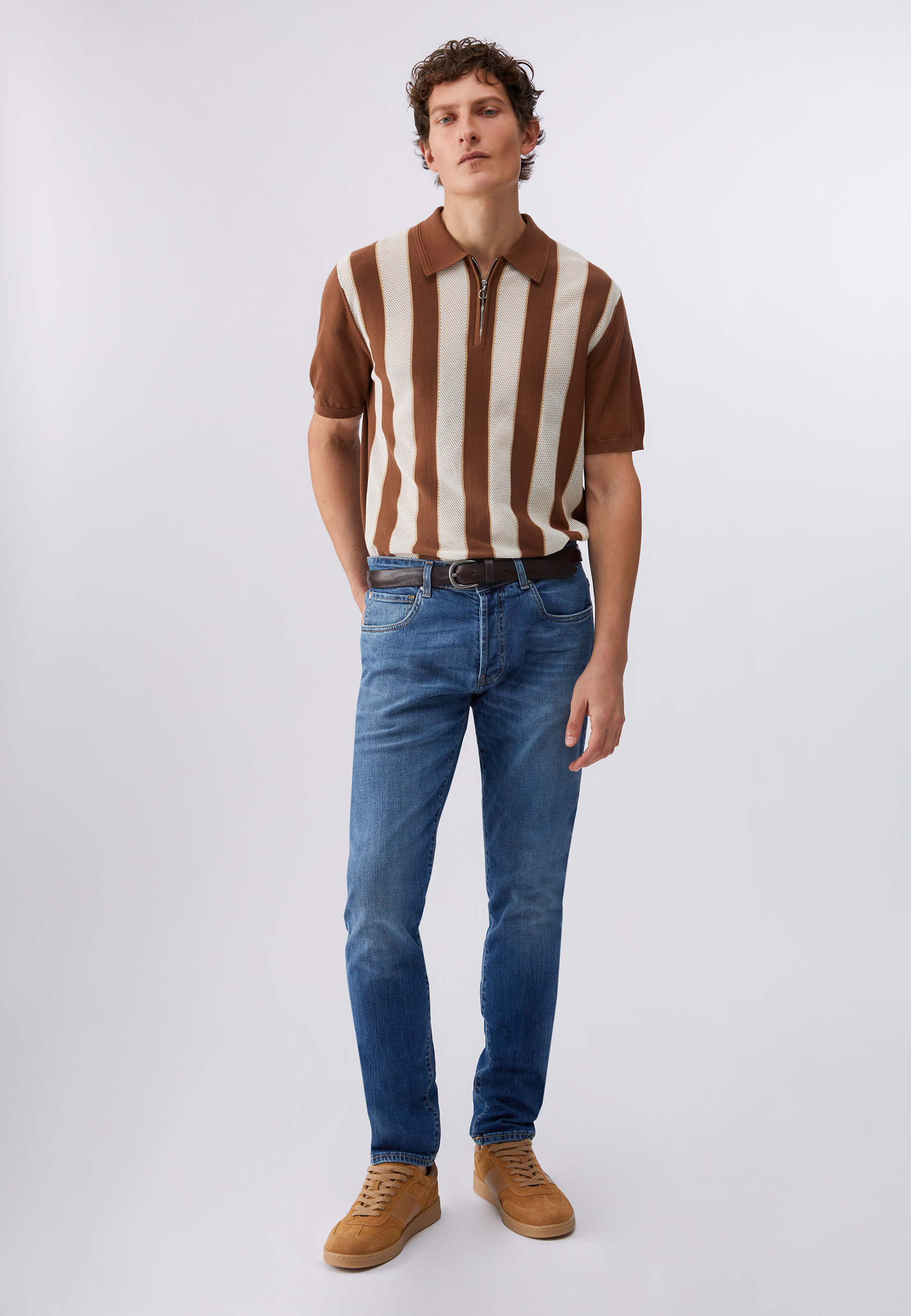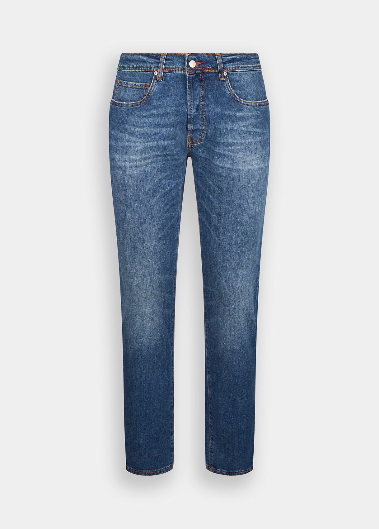Mens jeans in stretch denim Stonewash finish Comfortable waist Convenient pockets Slim leg Narrow hem Button and zip closure Leg length: 102 cm Hem width: 17.5 cm