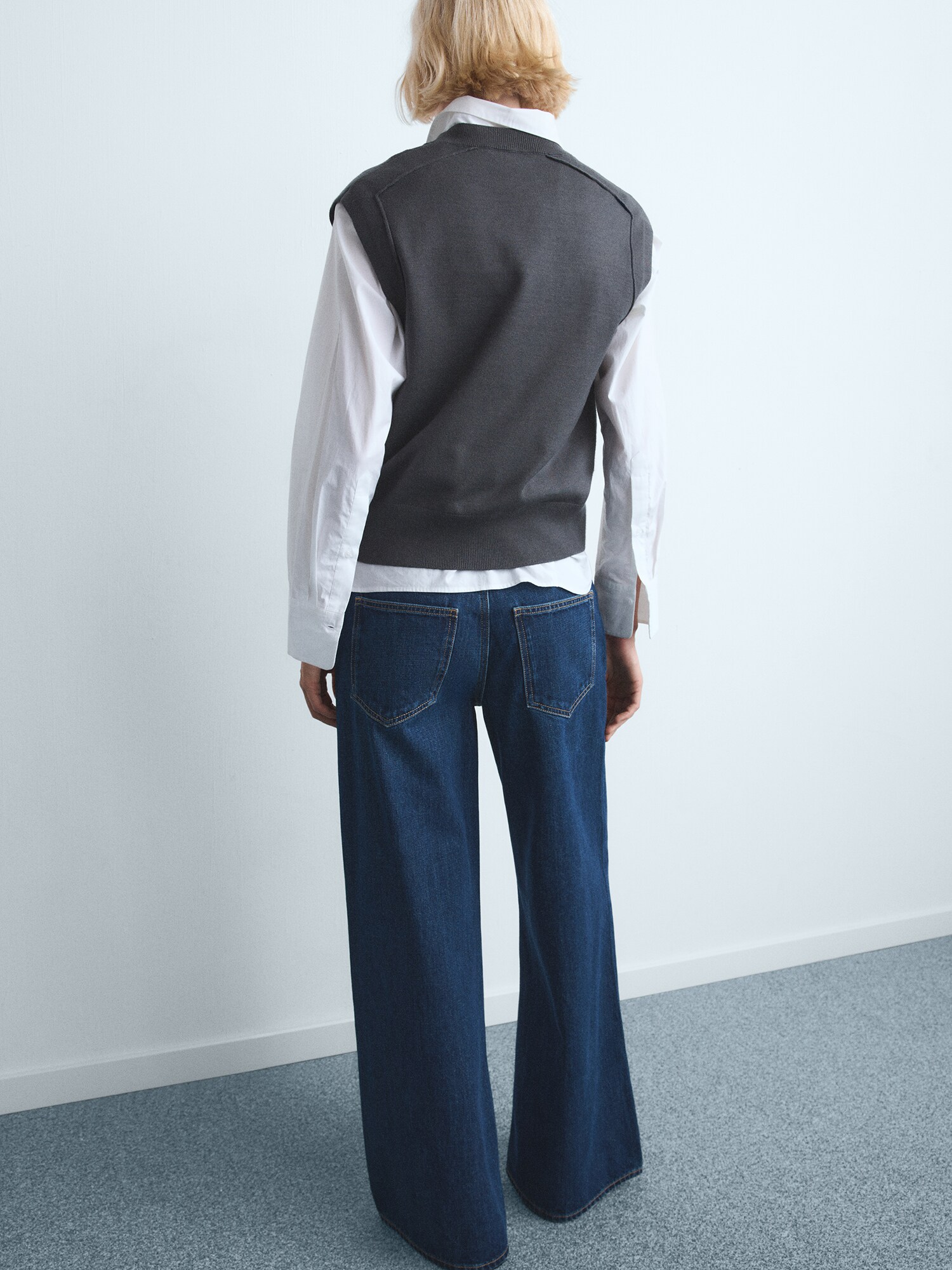 Design: Închidere cu fermoar, Model cu 5 buzunare; Tip de închidere: Fermoar; Material: Denim; Imprimeu: Monocrom; Detalii: Cusături contrastante, Material rigid, Găici pentru curea; Culoare: Rinsed/dark washed; Lungimea: Lung/maxi; Tipul croiului: Wide leg; Tipul taliei: Mid waist