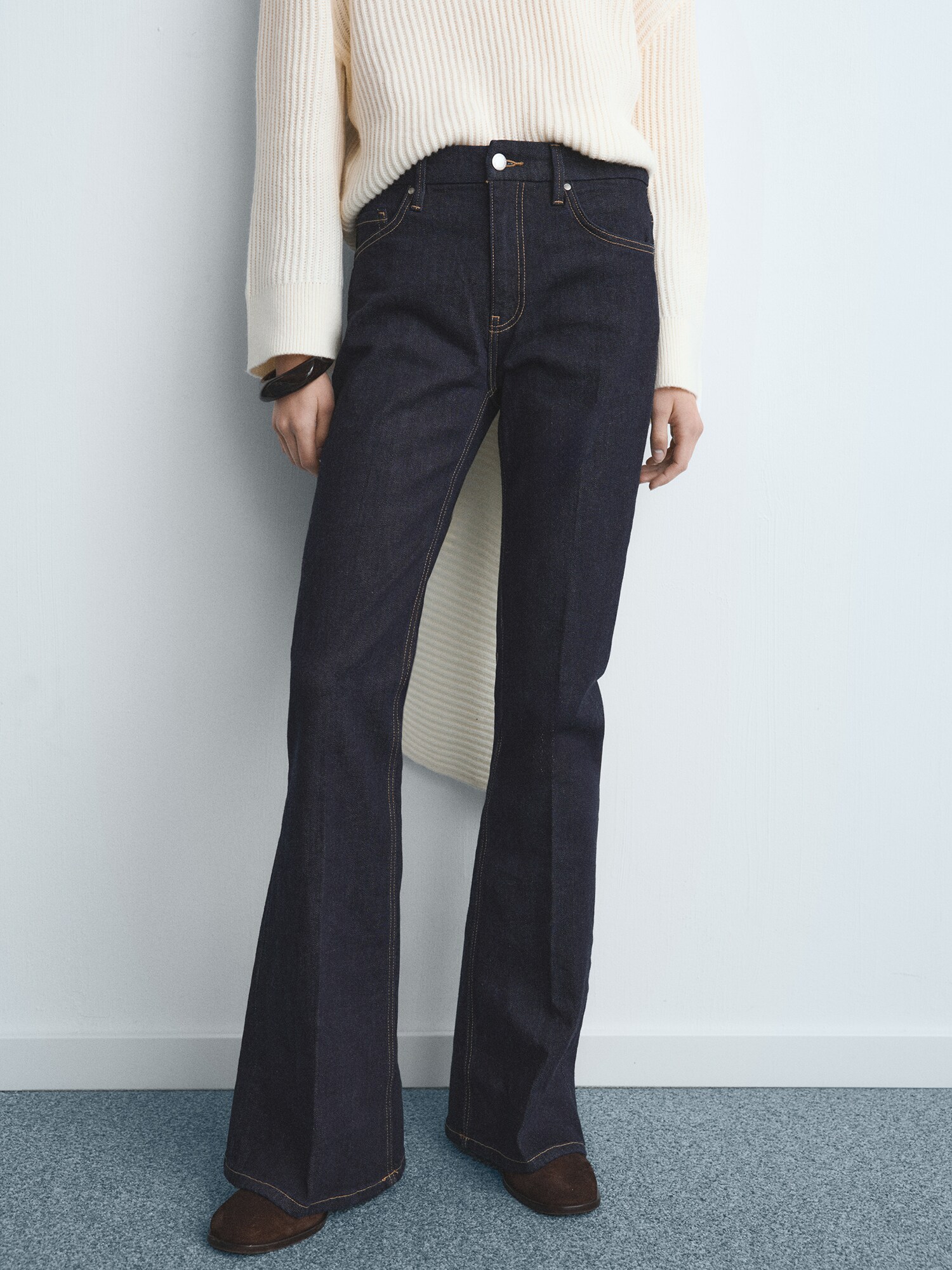 Design: Tiv/ margine tighelită, Model cu 5 buzunare; Tip de închidere: Fermoar; Material: Denim; Imprimeu: Monocrom; Detalii: Pliuri; Detalii: Pietricele decorative, Cusături contrastante, Găici pentru curea; Culoare: Rinsed/dark washed; Lungimea: Lung/maxi; Tipul croiului: Evazați; Tipul taliei: Mid waist