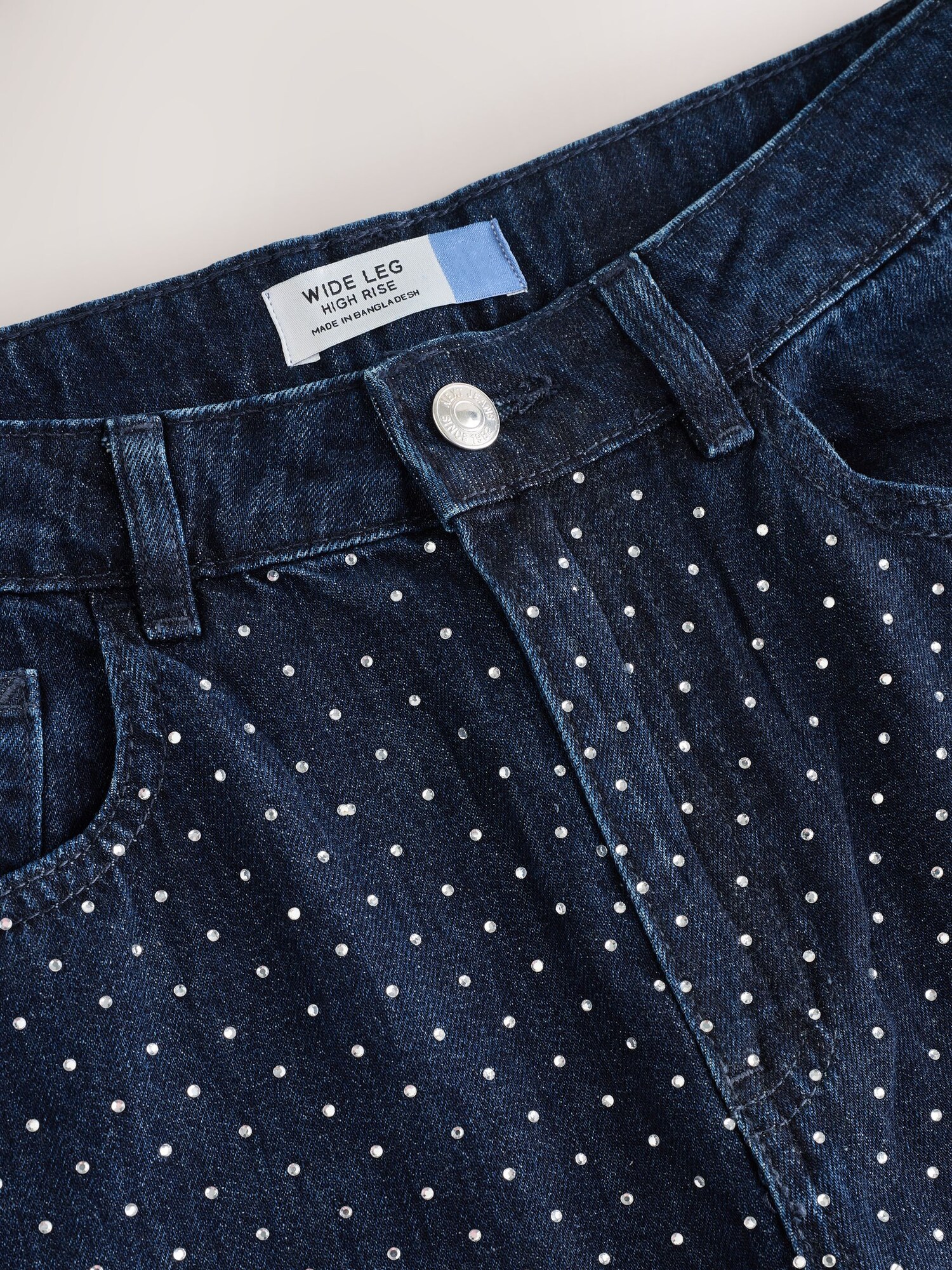 Design: Tiv/ margine tighelită, Model cu 5 buzunare; Material: Denim; Detalii: Pietre decorative; Detalii: Găici pentru curea; Culoare: Rinsed/dark washed; Lungimea: Lung/maxi; Tipul croiului: Wide leg; Tipul taliei: Mid waist