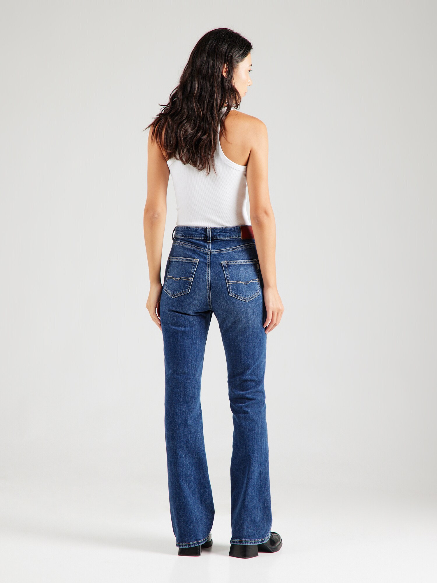 Design: Închidere cu fermoar, Model cu 5 buzunare; Tip de închidere: Închidere cu nasturi; Material: Denim; Imprimeu: Monocrom; Detalii: Pietricele decorative, Cusături contrastante, Găici pentru curea; Culoare: Heavy washed; Lungimea: Lung/maxi; Tipul croiului: Evazați; Tipul taliei: Mid waist