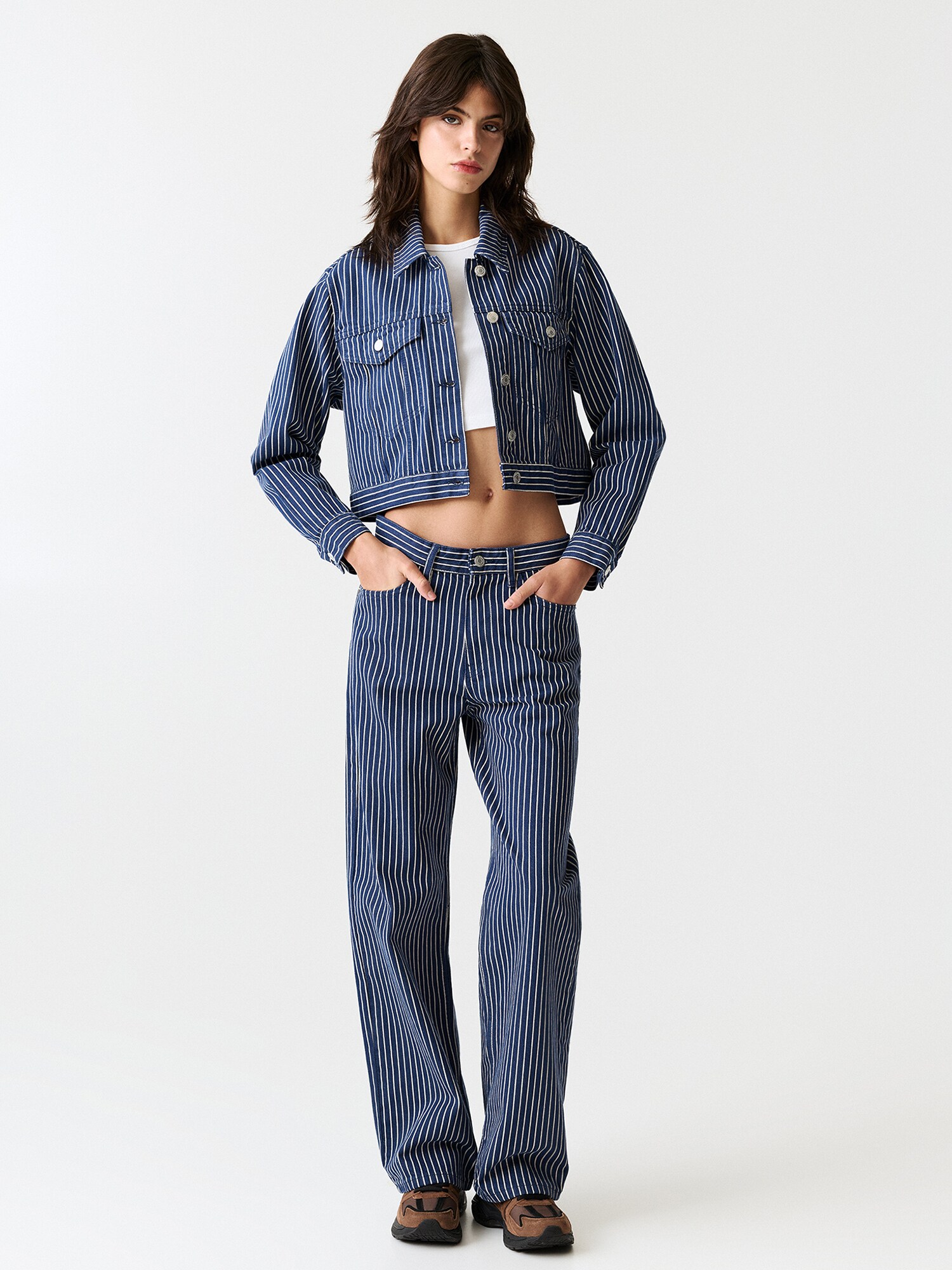 Design: Închidere cu fermoar, Model cu 5 buzunare; Tip de închidere: Fermoar; Material: Denim; Imprimeu: Cu dungi; Detalii: Imprimat în totalitate, Material rigid, Găici pentru curea; Lungimea: Lung/maxi; Tipul croiului: Wide leg; Tipul taliei: Mid waist