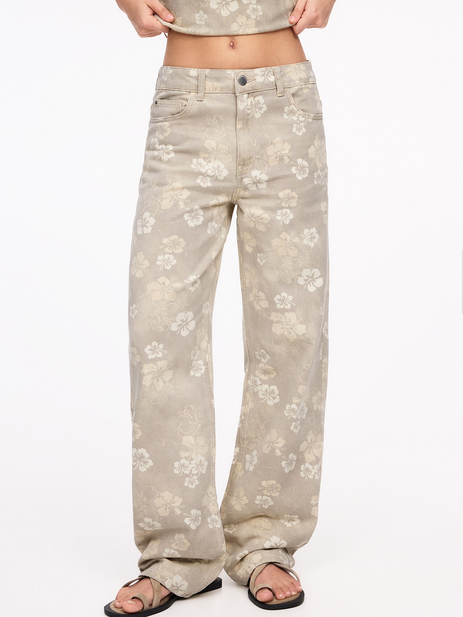 Design: Tiv/ margine tighelită, Închidere cu fermoar, Model cu 5 buzunare; Tip de închidere: Fermoar; Material: Denim; Imprimeu: Cu imprimeu floral; Detalii: Pietricele decorative, Imprimat în totalitate, Material rigid, Găici pentru curea; Lungimea: Lung/maxi; Tipul croiului: Wide leg; Tipul taliei: Mid waist