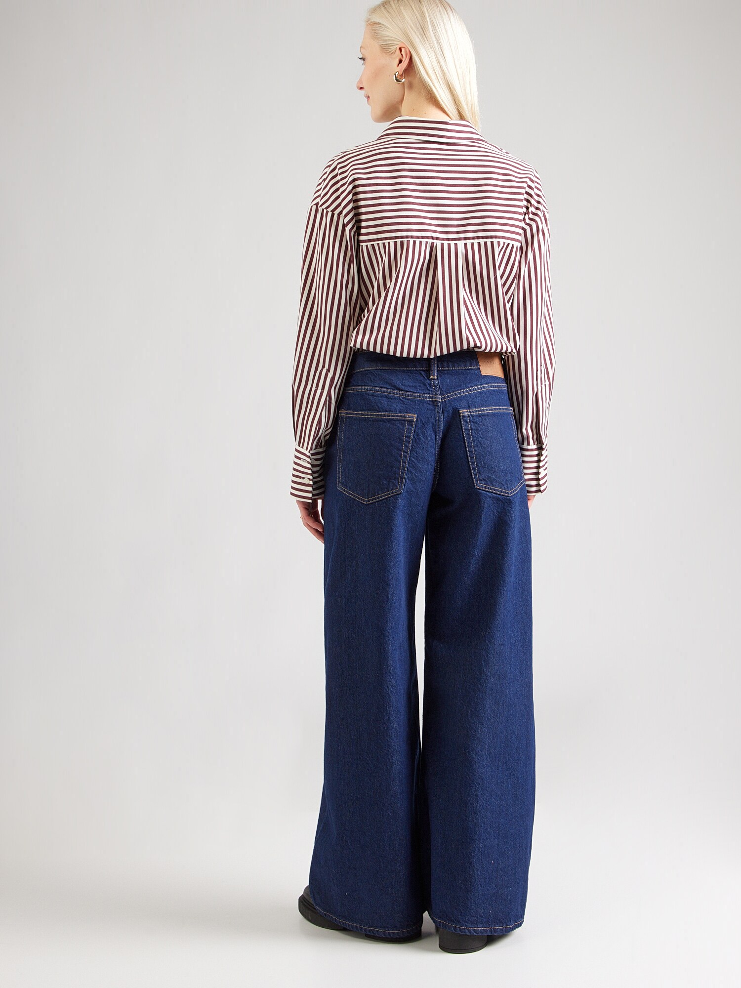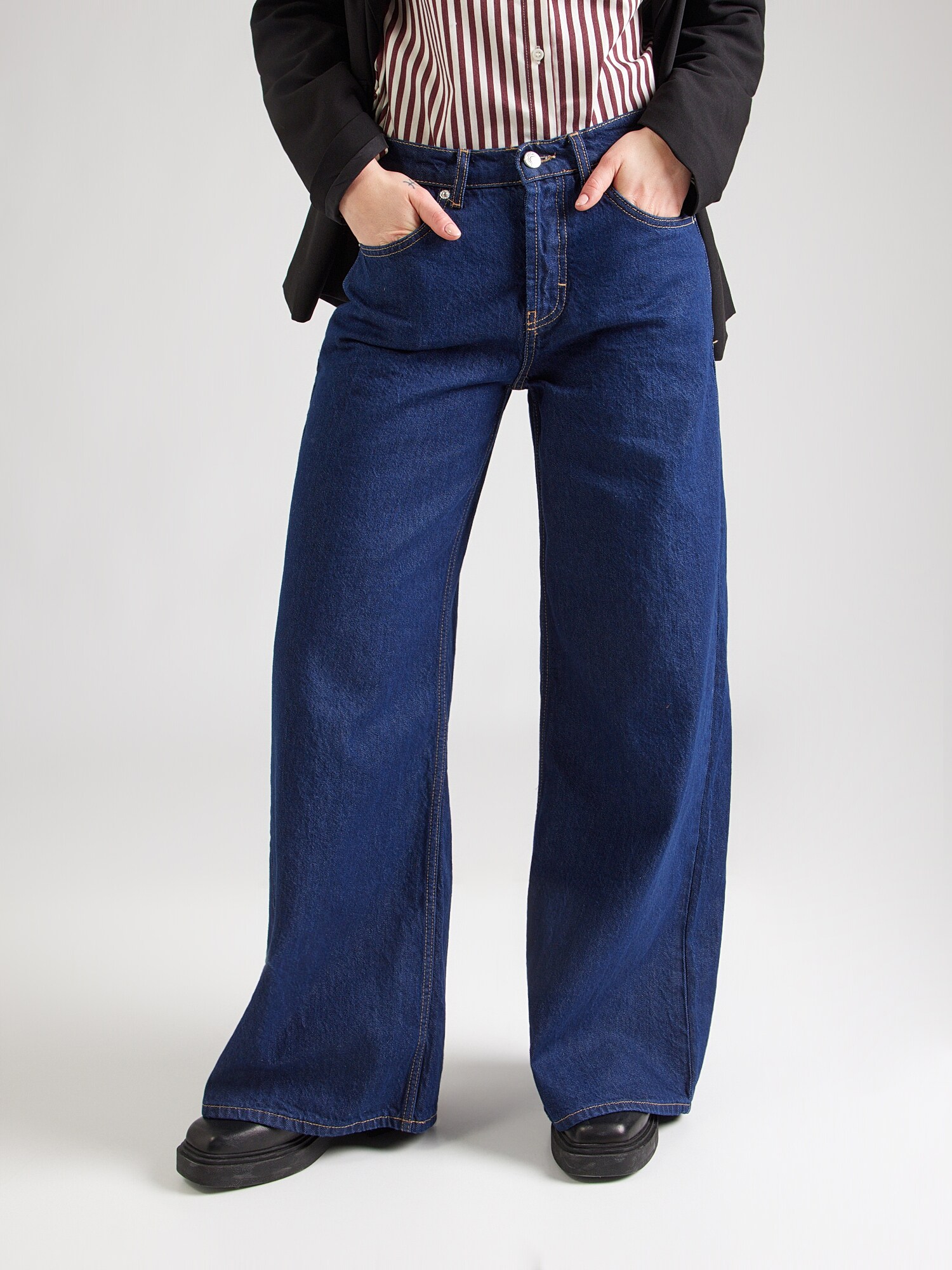 Design: Tiv/ margine tighelită, Închidere cu fermoar, Model cu 5 buzunare, Închidere cu nasturi; Tip de închidere: Fermoar; Material: Denim; Imprimeu: Monocrom; Detalii: Cusături contrastante, Petic cu logo, Efect prespălat, Material rigid, Găici pentru curea; Culoare: Denim albastru/ washed; Lungimea: Lung/maxi; Tipul croiului: Wide leg; Tipul taliei: Mid waist