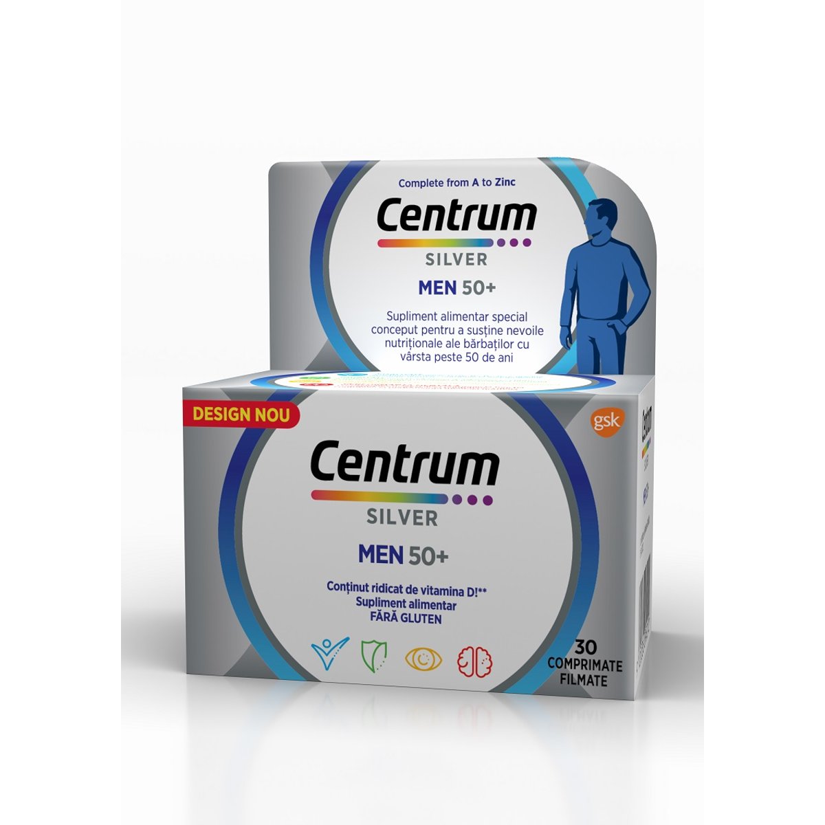 Vitamina B1 sustine functionarea normala a inimii Multivitaminele Centrum pentru barbati cu varsta peste 50 de ani sunt special formulate cu nutrienti esentiali, inclusiv vitamina B1 pentru a contribui la functionarea normala a inimii. Sustine functia cognitiva si performanta mentala normala Contine fier si zinc care contribuie la functia cognitiva normala si acid pantotenic care contribuie la performanta mentala normala. Contine magneziu, vitamina D3, si calciu care contribuie la functionarea normala a sistemului muscular Acest complex de vitamine si minerale pentru barbati cu varsta peste 50 de ani are un continut ajustat de vitamine si minerale pentru a sustine functionarea normala a sistemului muscular. Comprimate filmate special formulate pentru barbatii peste 50 de ani. Ia 1 pe zi! Acesta este un supliment alimentar. Cititi cu atentie informatiile de pe ambalaj. PM-RO-CNT-23-00038 Centrum Silver Men 50+ Beneficii Special formulat pentru a satisface nevoile nutritionale ale barbatilor peste 50 de ani, cu vitamine si minerale care sa sustina zilnic: Eliberarea necesarului energetic* Functionarea normala a sistemului imunitar** Functionarea normala a inimii*** Mentinerea vederii normale**** Functia cognitiva si performanta mentala normala***** Functionarea normala a sistemului muscular****** Nutrienti esentiali (per 1 comprimat) Vitamina A 800 ug (100%); vitamina E 24 mg (200%%; vitamina C 80 mg (100%%; vitamina K 30 pg (40%% vitamina B, 1,65 mg (150%% vitamina B,2,1 mg (150%); vitamina B, 2,1 mg (150%% vitamina B,2 7,5 ug (300%* vitamina D, 15 ug (300%* blotina 75 pg (150%k acid follc 300 ug (150%% niacina 24 mg (150%); acid pantotenic 9 mg (150%% calciu 200 mg (25%% fosfor 105 mg (15%): magnezlu 135 mg (36%% her 2,1 mg (15%); iod 100 ug (67%% cupru 0,5 mg (50%) crom 40 ug (100%); molibden 50 ng (100%%; seleniu 45 ug (82%) zinc 5 mg (50%). Format Comprimate filmate. Proprietati Include complexul de vitamine B si magneziu pentru a contribui la metabolismul energetic normal. Contine vitaminele A, C si D, cupru ??i zinc pentru a contribui la func??ionarea normal?? a sistemului imunitar. Vitamina B, contribuie la func??ionarea normal?? a inimi. Vitamina A, vitamina B2 si zincul contribuie la men??inerea vederii normale. Con??ine fier si zinc care contribuie la func??ia cognitiv?? normal?? ??i acid pantotenic care contribuie la performan??a mentala normala. Con??ine calciu, magneziu ??i vitamina D, care contribuie la func??ionarea normal a sistemului muscular. *din valoarea nutri??ional?? de referin????.