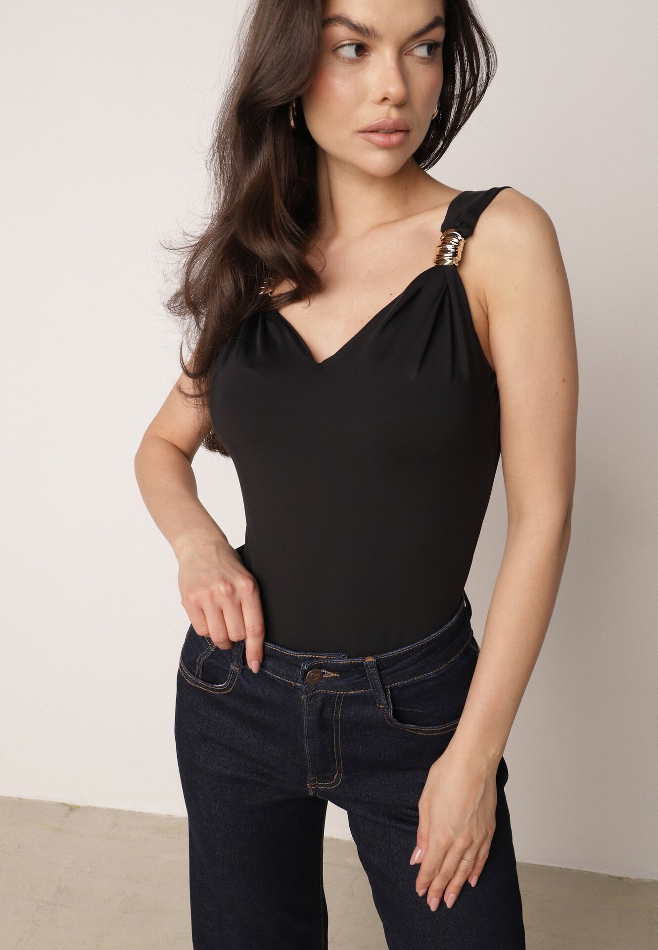 Body Negru Clasic cu Aplicații Metalice pe Bretele Nesseva