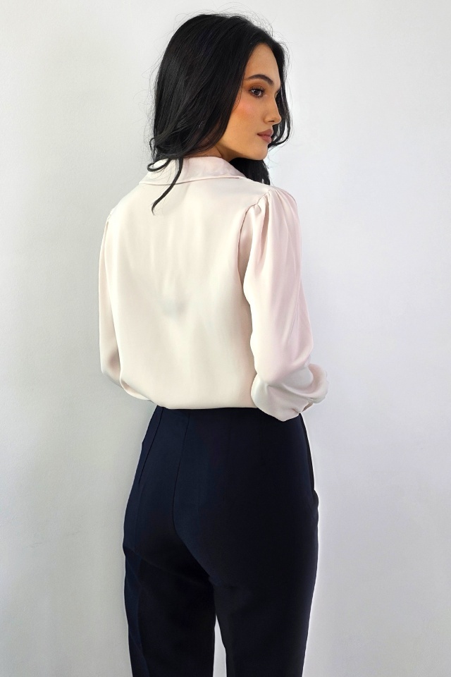 Cand minimalismul devine sofisticat. Feminitate discreta, impact real. Camasa este conceputa fara sistem de inchidere, avand un design curat si fluid, cu un efect vizual de prindere ascunsa. Sub decolteu este integrata o pensa discreta, care creeaza iluzia unei inchideri frontale si contribuie la o linie eleganta si bine echilibrata. Textura fina cu aspect matasos ofera o cadere naturala si un finisaj neted, accentuand feminitatea piesei. Manecile lungi sunt completate de mansete clasice cu prindere prin nasture, pastrand structura camasii si oferind confort la purtare. Camasa este insotita de un lantic detasabil, accesorizat cu o perla artizanala si un layout delicat, care poate fi purtat optional pentru a adauga un accent subtil si sofisticat tinutei. Accesoriul permite personalizarea stilului, in functie de contextul vestimentar. Produsul este usor de integrat in tinute elegante, office sau smart casual, fiind potrivit pentru combinatii cu pantaloni cu talie inalta, fuste sau piese structurate. Designul imbina simplitatea cu detalii atent lucrate, rezultand o camasa versatila, cu impact vizual discret si rafinat. Caracteristici camasa : - lungime medie, cu tipar lejer si umeri usor bufanti - decolteu in V, fara sistem de inchidere - guler cu revere scurte ascutite - accesoriu inclus: lantic detasabil Detaliu lantic: perla artizanala, layout delicat - croiala cu maneca lunga si manseta, inchidere clasica - model prezent in mai multe variante cromatice - compozitie material cu aspect matasos: 100% poliester; Lungime produs; 55 cm; Circumferinta bust: 80- 120cm; Lungime maneca: 60 cm; Marimea universala este compatibila cu marimea S sau marimea M Manechinul nostru a asortat camasa AVELA cu pantalonii eleganti ChicMe(aici) Eticheta produsului conține informații esențiale referitoare la întreținerea și spălarea corectă a articolelor vestimentare. Imaginile Fashionforyou au caracter informativ, iar nuanta, tonul si intensitatea culorii pot varia in functie de monitor/ecran telefon.
