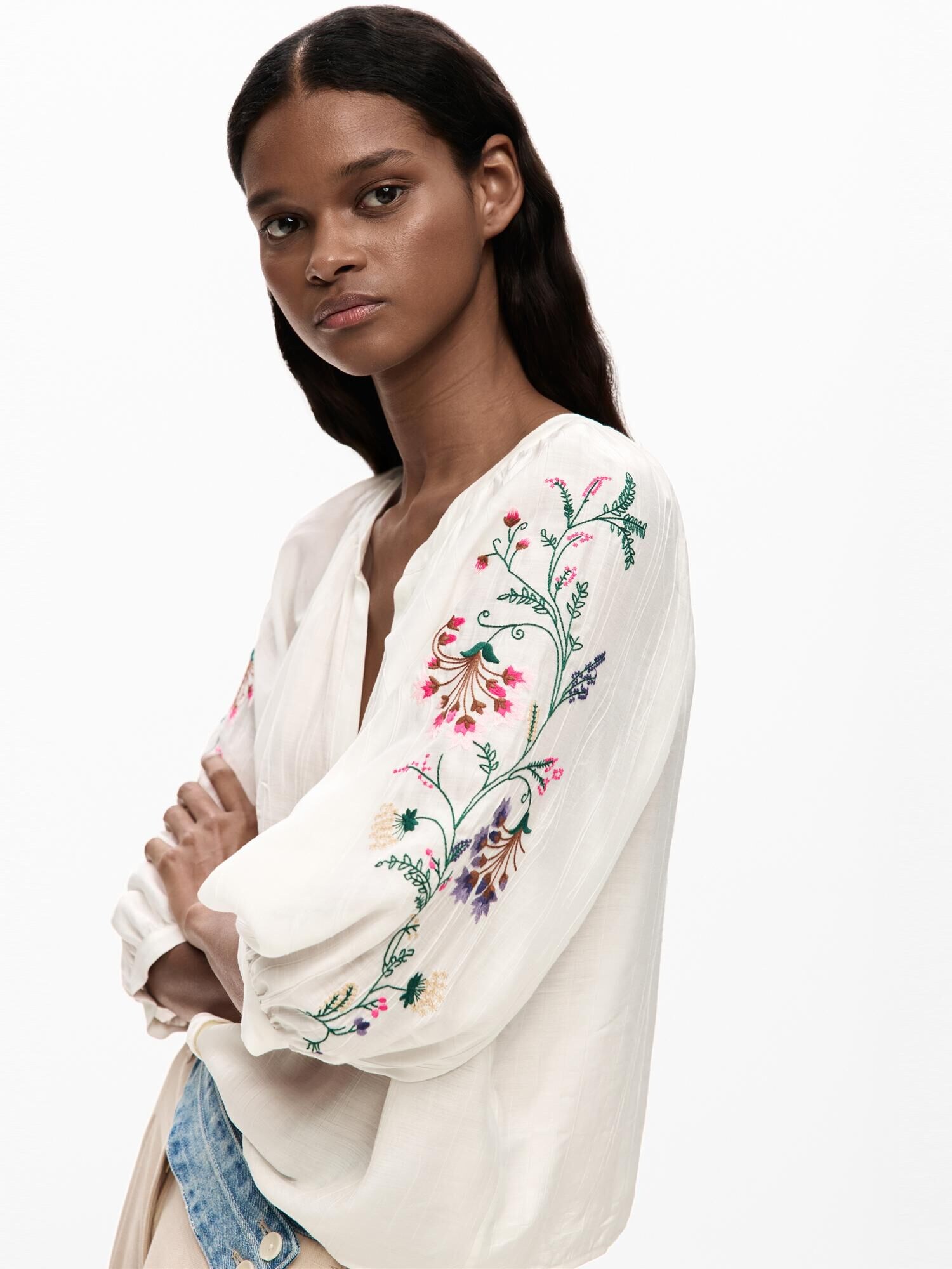 Modelul bluzei: Bluză clasică; Design: Șir de nasturi, Mâneci bufante; Tip de închidere: Închidere cu nasturi; Material: Viscoză; Imprimeu: Cu imprimeu floral; Guler de cămașă: Decolteu tunică; Detalii: Broderie, Drapat; Detalii: Cusături ton în ton; Croi: Croi normal; Lungime mâneci: Mâncecă lungă; Lungime: Lungime normală