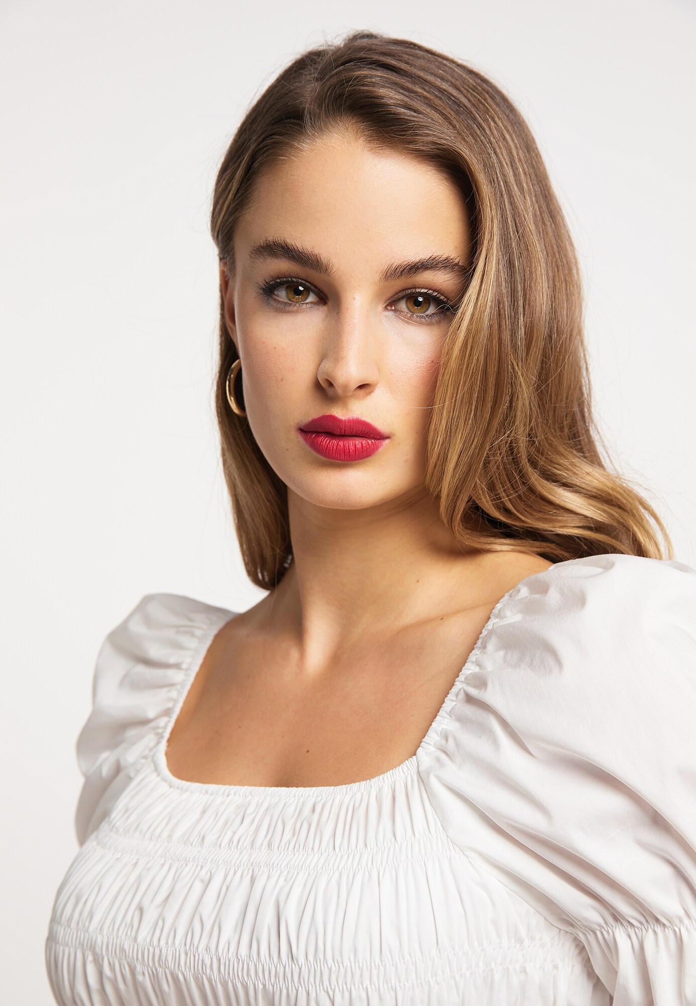 Modelul bluzei: Cămașă tip tricou; Design: Tiv/ margine tighelită, Mâneci bufante, Umeri goi/ off-shoulder, Benzi elastice; Material: Bumbac; Imprimeu: Monocrom; Guler de cămașă: Fără guler; Detalii: Drapat; Detalii: Cusături ton în ton; Croi: Croi mulat; Lungime mâneci: Mâncecă lungă; Lungime: Croi scurt
