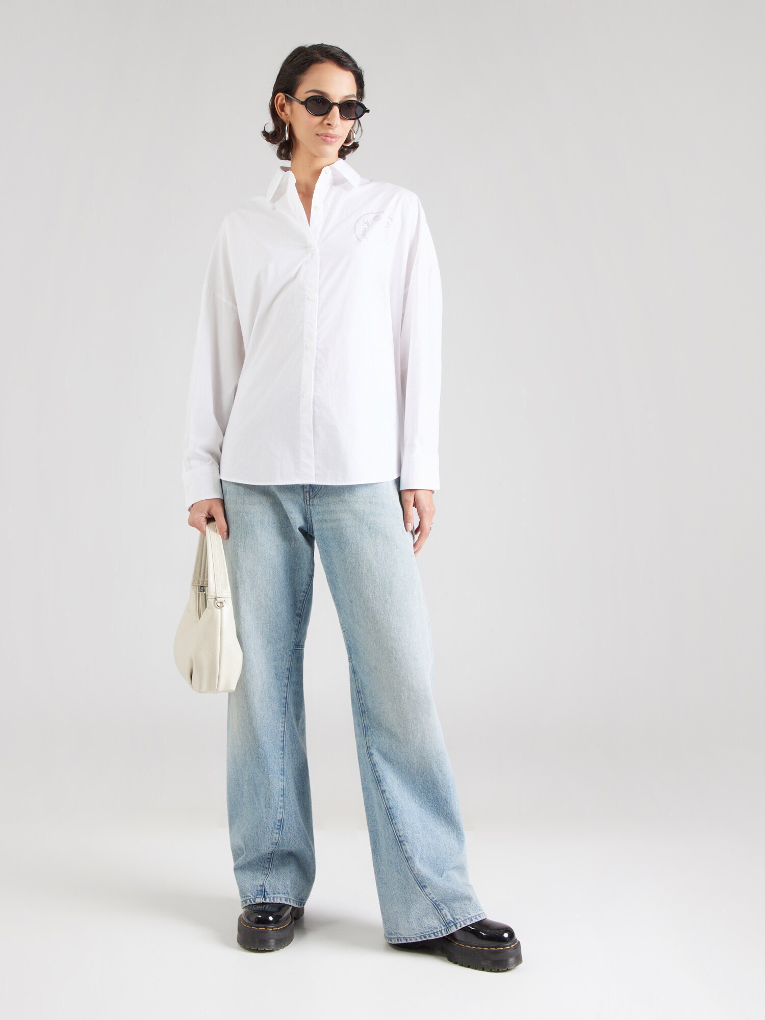 Modelul bluzei: Bluză clasică; Design: Supradimensionat, Tiv rotund, Umăr întretăiat; Tip de închidere: Închidere cu nasturi; Material: Bumbac; Imprimeu: Cu logo imprimat; Guler de cămașă: Guler Kent; Detalii: Pietre decorative; Detalii: Sclipitor, Aplicații, Material moale; Croi: Croi larg; Lungime mâneci: Mâncecă lungă; Lungime: Lungime normală