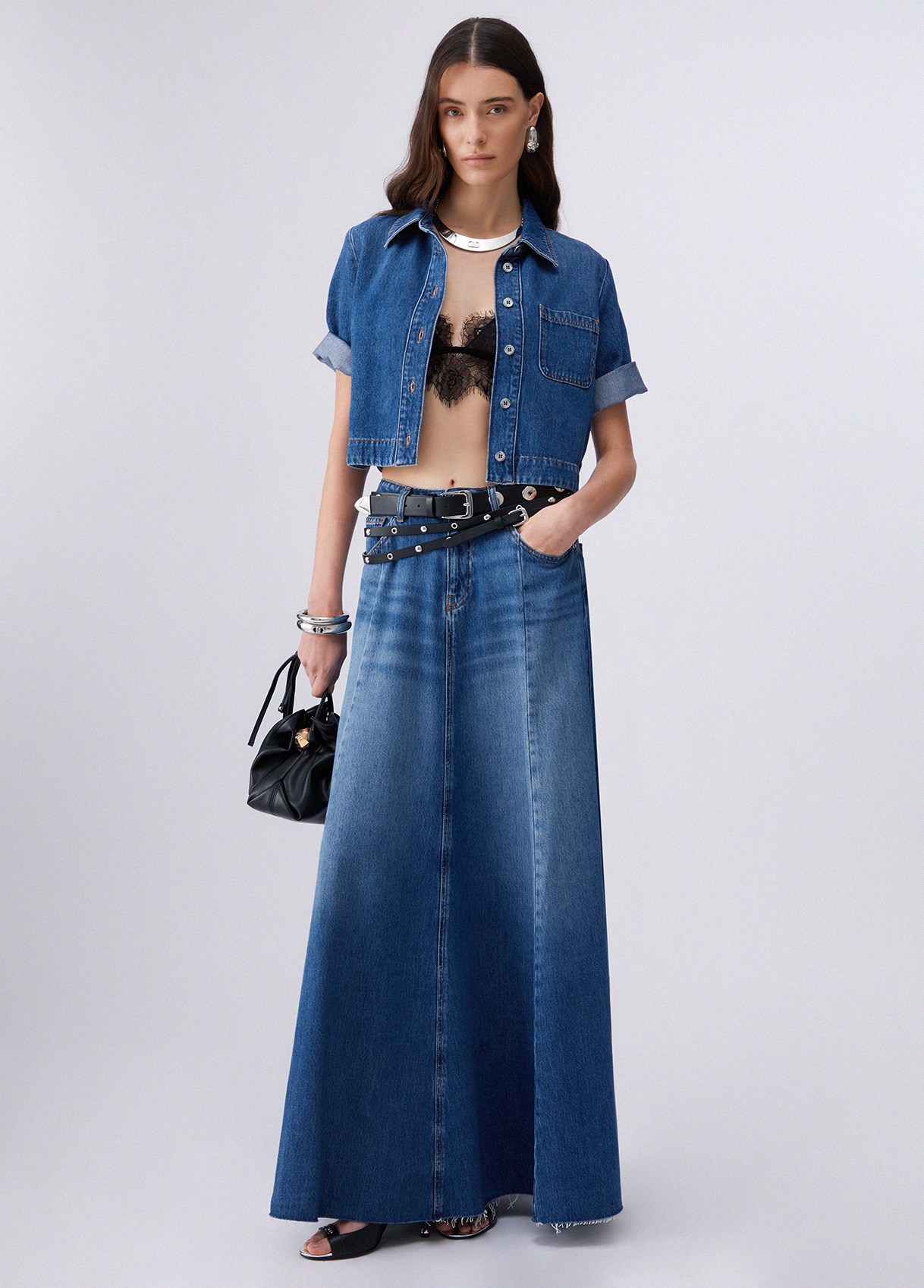 Boxy denim shirt Short sleeves Applied print Front button closure Logo patch on the back