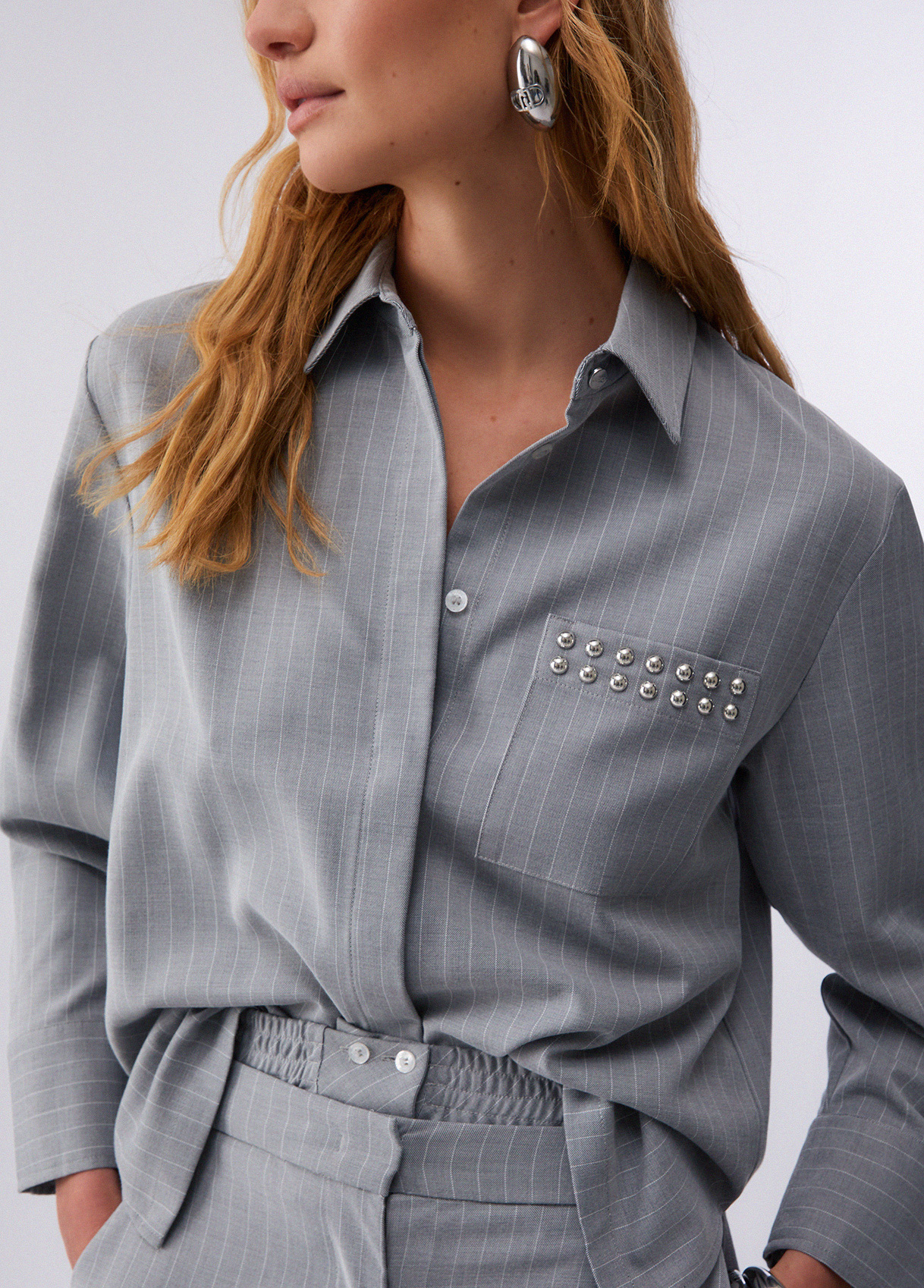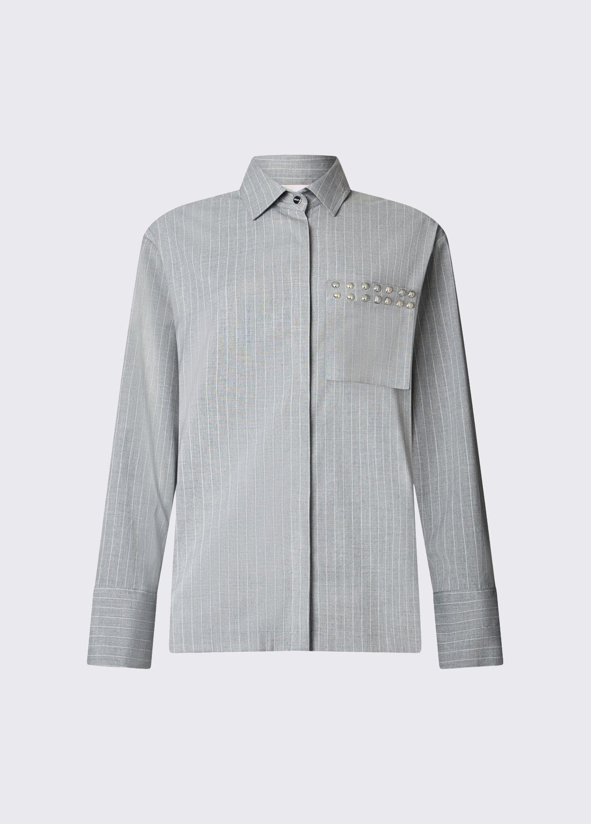 Pinstripe shirt Pocket with stud appliqués Hidden button fastening