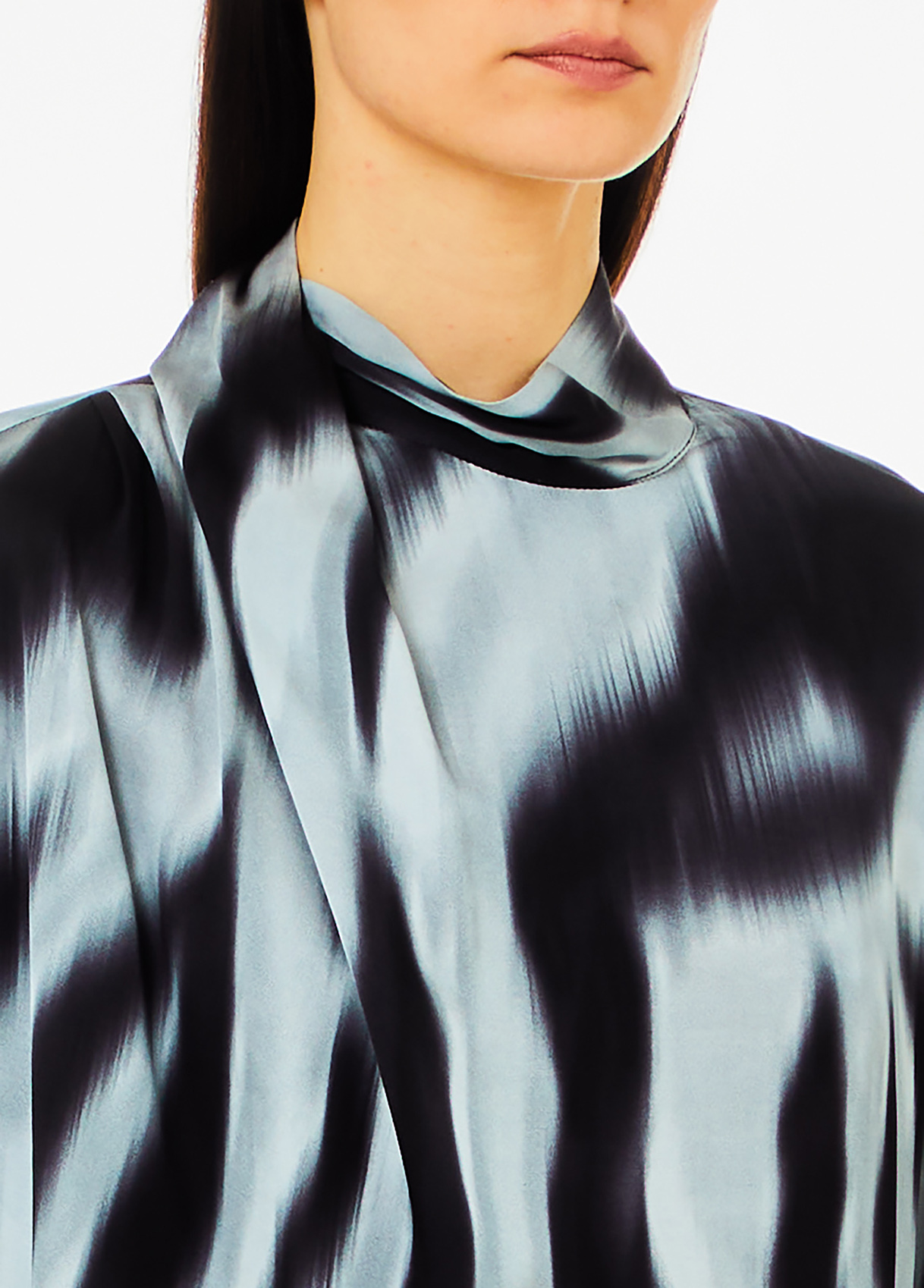 Viscose satin blouse All over zebra print High neck with bejewelled buttons on back Keyhole opening on back Long sleeves Bell cuffs “Liu Jo Better” Product