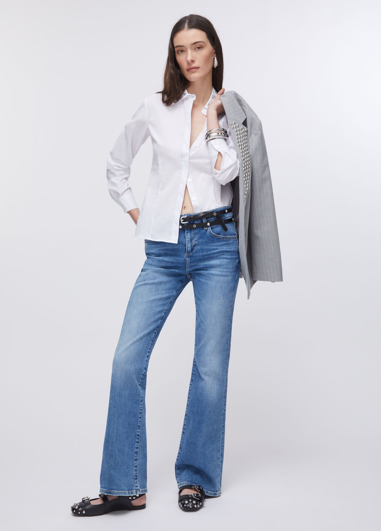 Long-sleeved poplin shirt Collar with bejewelled embellishment Concealed front button closure Slim fit