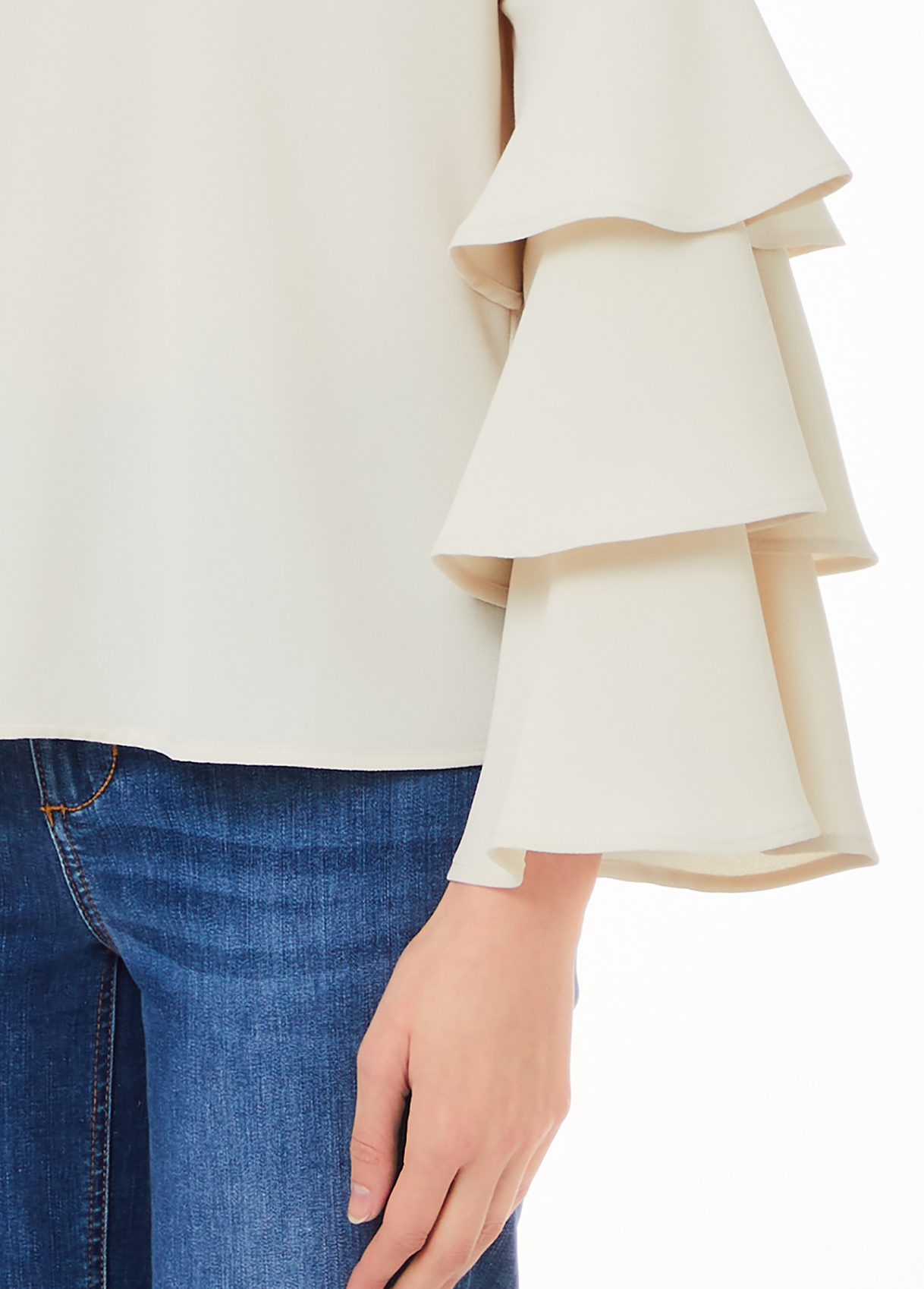 Stretch crepe blouse Round-neck cut with button on the back Long ruffled sleeves Metal logo on the back