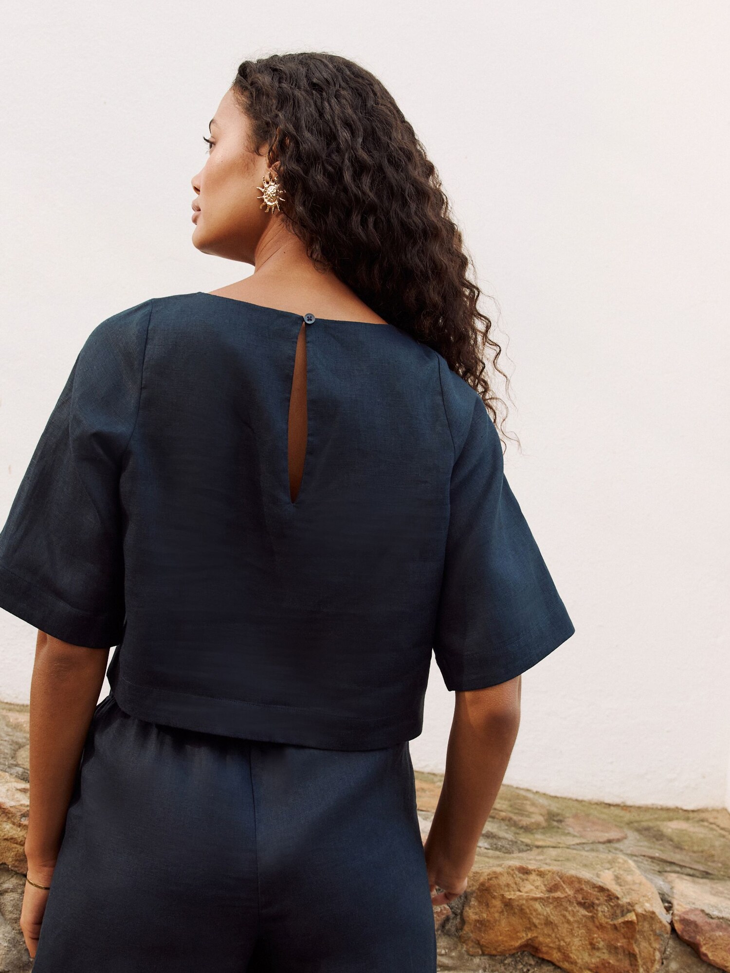 Modelul bluzei: Cămașă tip tricou; Design: Tiv/ margine tighelită; Tip de închidere: Închidere cu nasturi; Material: In; Imprimeu: Monocrom; Guler de cămașă: Fără guler; Detalii: Cu decupaje; Detalii: Material moale; Croi: Croi lejer; Lungime mâneci: Mâneci medii; Lungime: Croi scurt