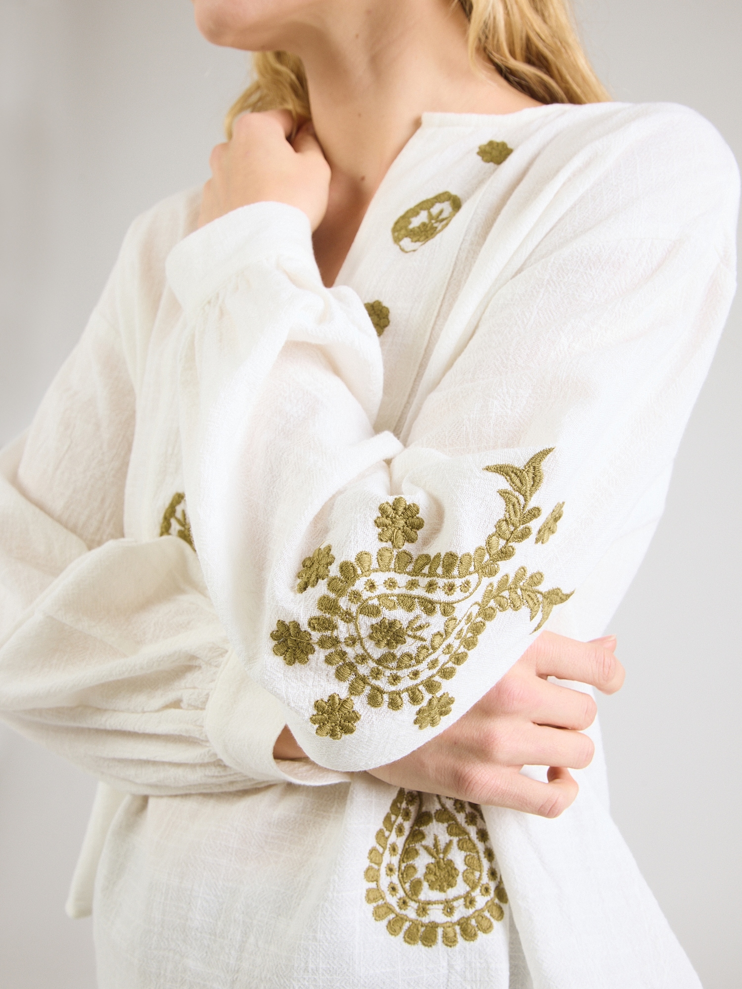 Modelul bluzei: Cămașă tip tricou; Design: Tiv/ margine tighelită, Umăr întretăiat; Material: Bumbac; Imprimeu: Model etnic; Guler de cămașă: Decolteu tunică; Detalii: Broderie, Drapat; Detalii: Cusături ton în ton, Material curgător; Croi: Croi lejer; Lungime mâneci: Mâncecă lungă; Lungime: Lungime normală