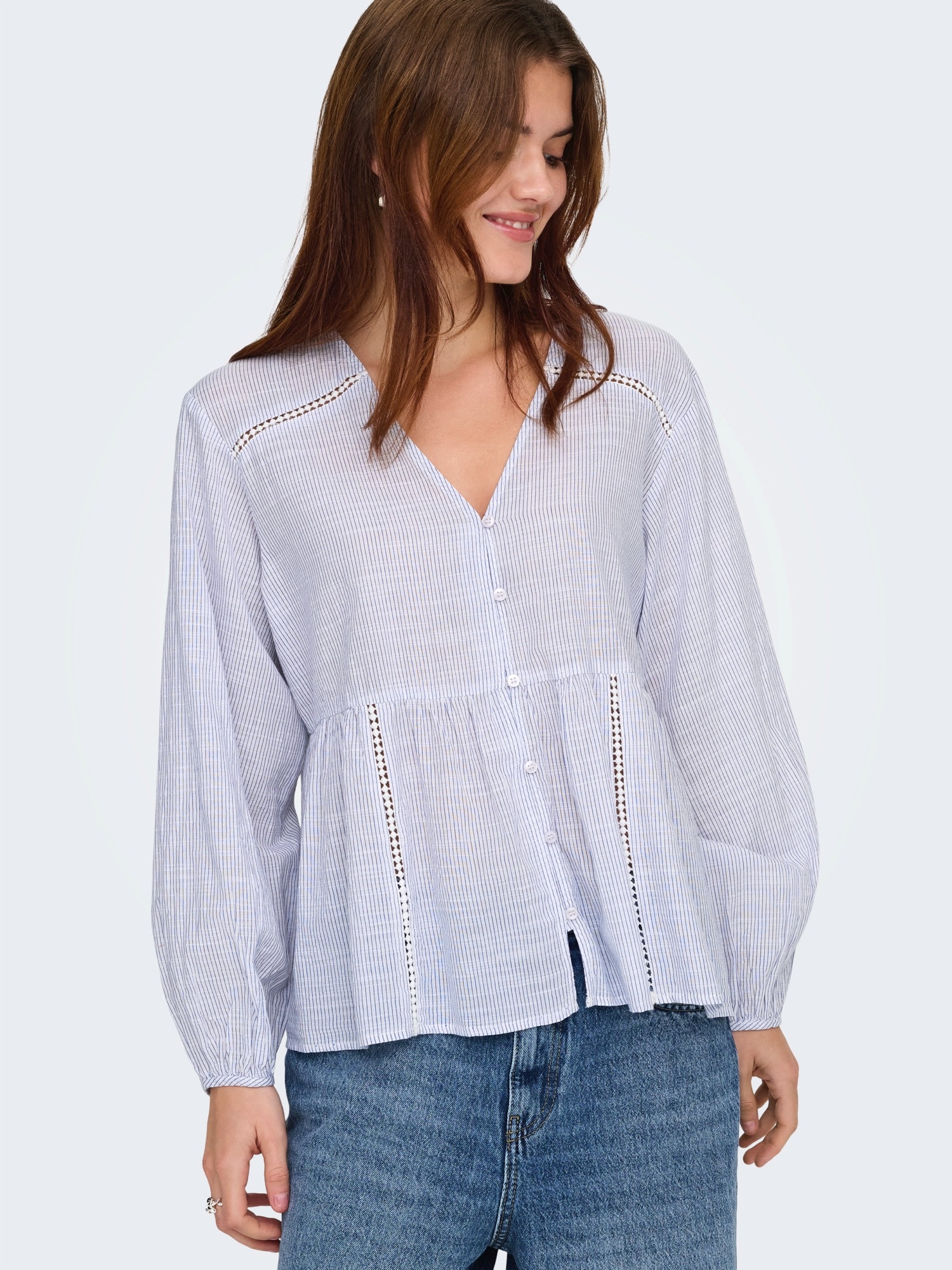 Modelul bluzei: Bluză clasică; Design: Tiv/ margine tighelită, Șir de nasturi, Pliu spate; Tip de închidere: Închidere cu nasturi; Material: Bumbac; Imprimeu: Cu dungi; Guler de cămașă: Fără guler; Detalii: Pliuri, Drapat, Model cu găuri; Detalii: Imprimat în totalitate, Material moale; Croi: Croi normal; Lungime mâneci: Mâncecă lungă; Lungime: Lungime normală