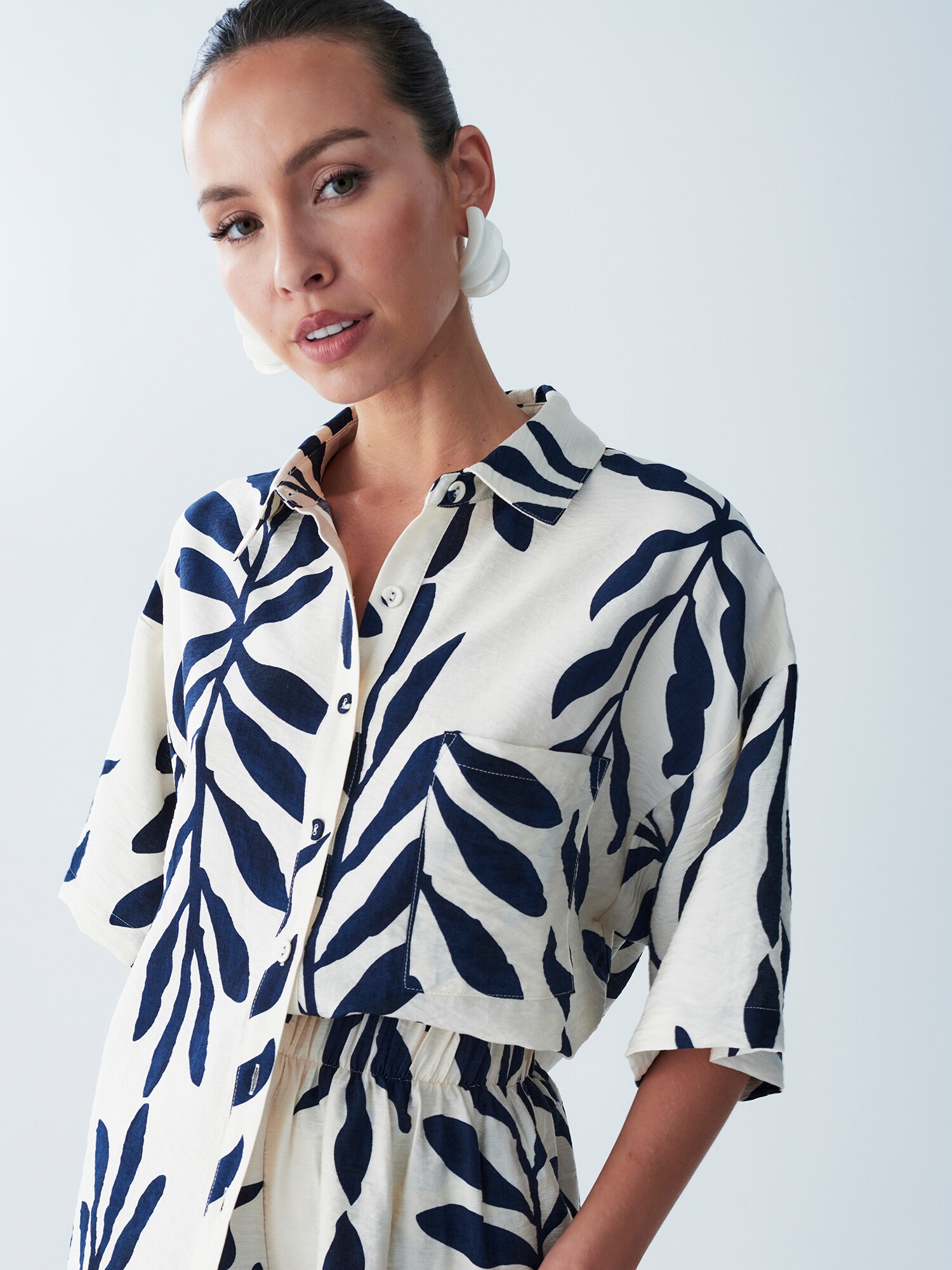 Modelul bluzei: Bluză clasică; Design: Tiv/ margine tighelită, Șir de nasturi, Buzunar la piept; Tip de închidere: Închidere cu nasturi; Material: Viscoză; Imprimeu: Cu imprimeu floral; Guler de cămașă: Guler Kent; Detalii: Pliuri; Detalii: Imprimat în totalitate, Material curgător; Croi: Croi larg; Lungime mâneci: Mâneci medii; Lungime: Croi lung