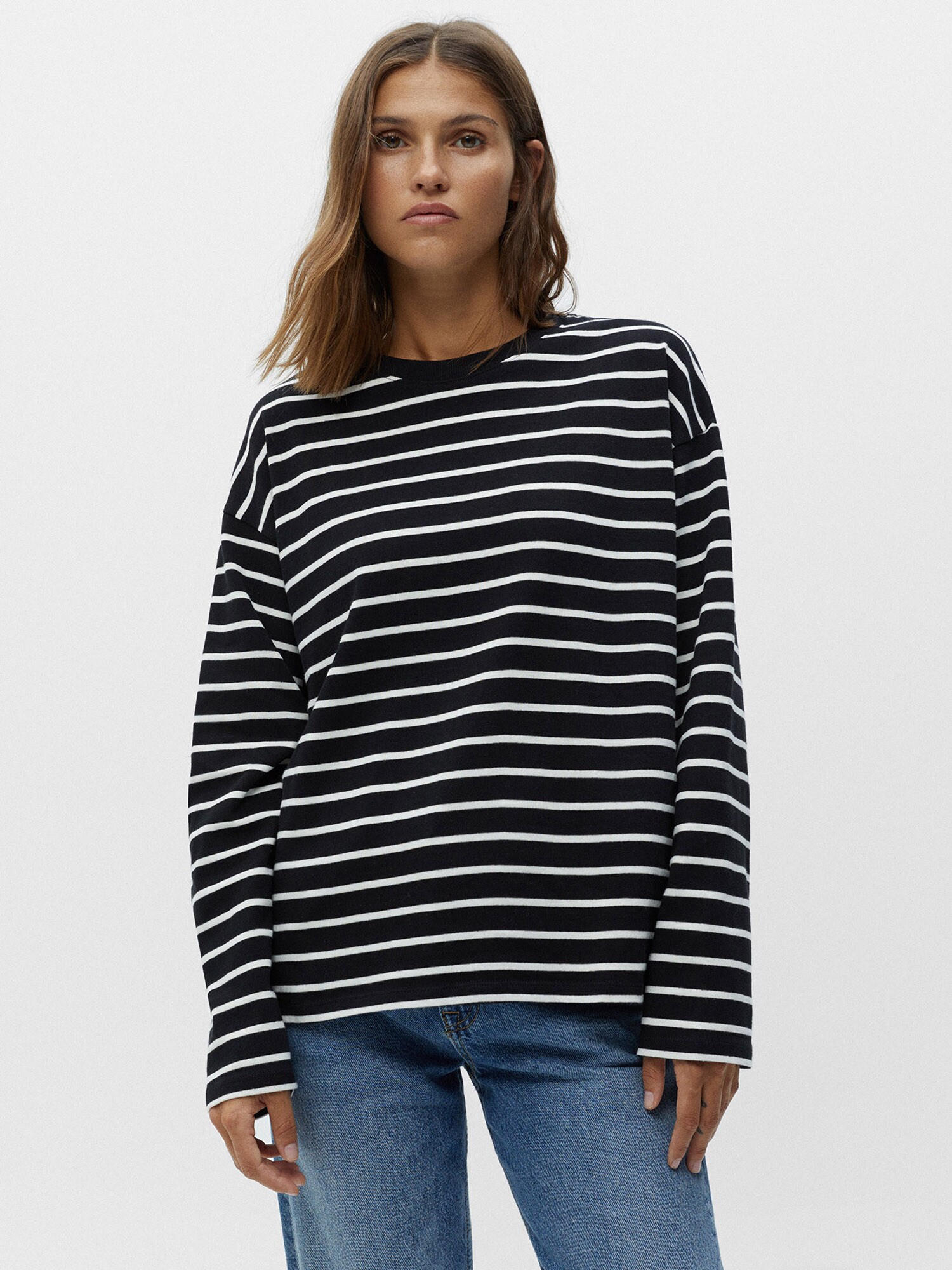 Design: Tiv/ margine tighelită, Guler din tricot cu striații, Tiv drept, Umăr întretăiat; Material: Jerseu; Decolteu: Decolteu rotund; Imprimeu: Cu dungi; Detalii: Imprimat în totalitate, Material moale, Material prietenos cu pielea; Croi: Croi lejer; Lungime mâneci: Mâncecă lungă; Lungime: Lungime normală