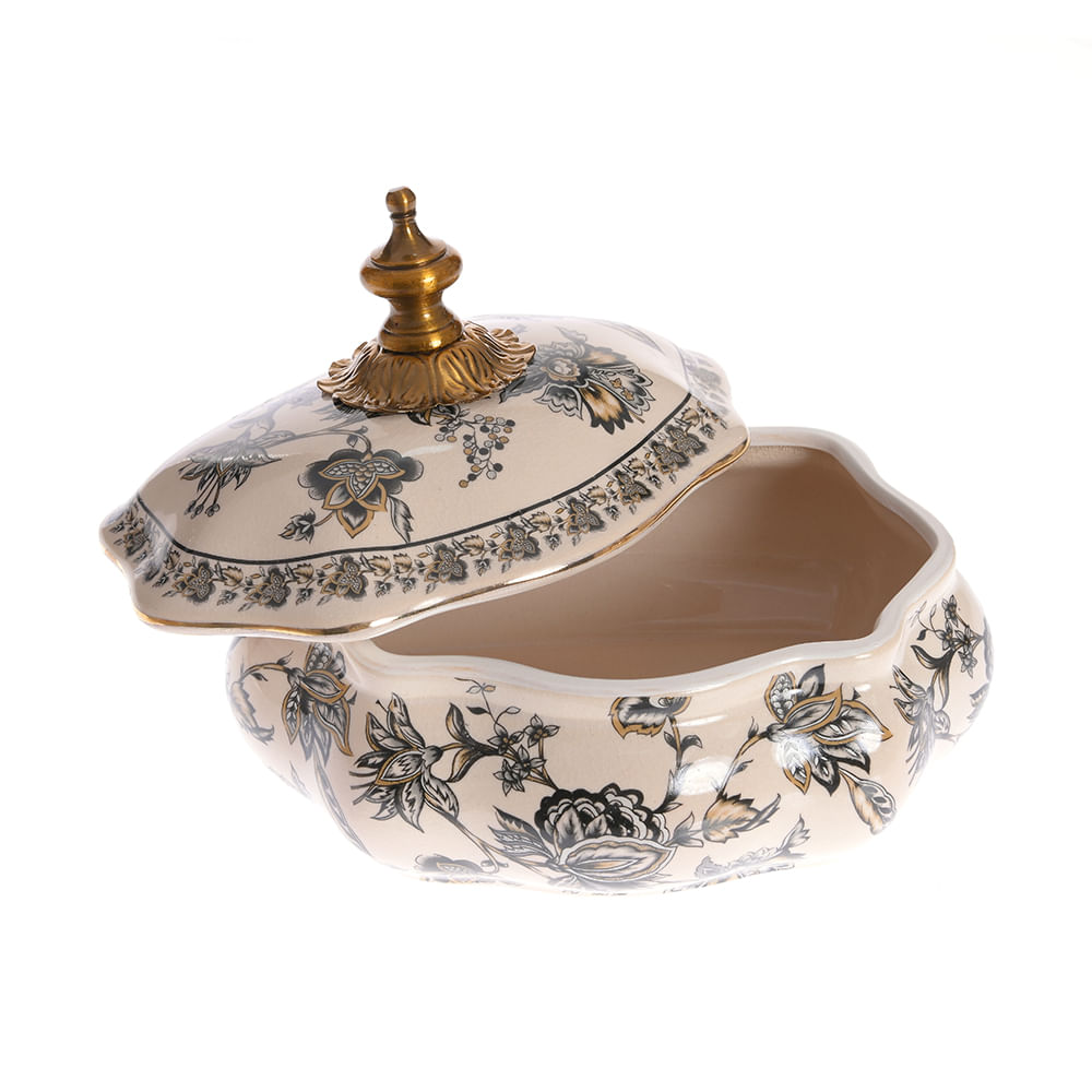 Bol vintage decorativ din ceramica cu capac si detalii florale aurii 22 cm