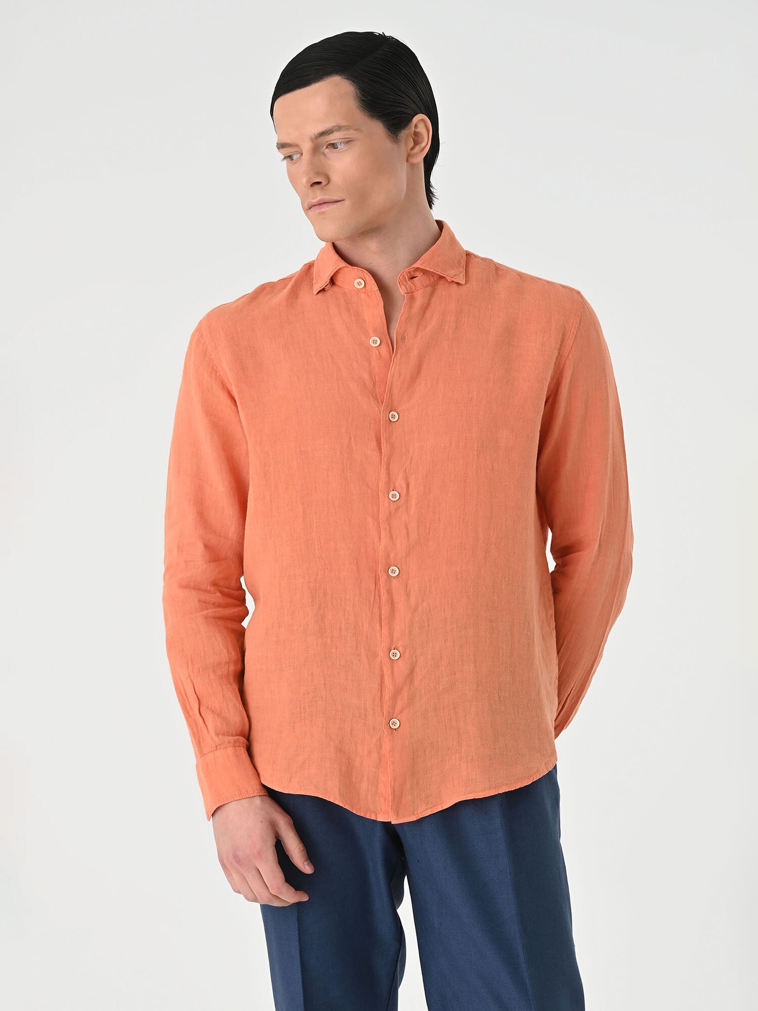 Design: Croi drept, Șir de nasturi, Manșete cu striații, Tiv rotund, Necktape; Tip de închidere: Închidere cu nasturi; Material: In; Imprimeu: Monocrom; Guler de cămașă: Guler Kent; Detalii: Material delicat, Material ușor, Material moale; Tipul croiului: Regular fit; Lungime mâneci: Mâncecă lungă