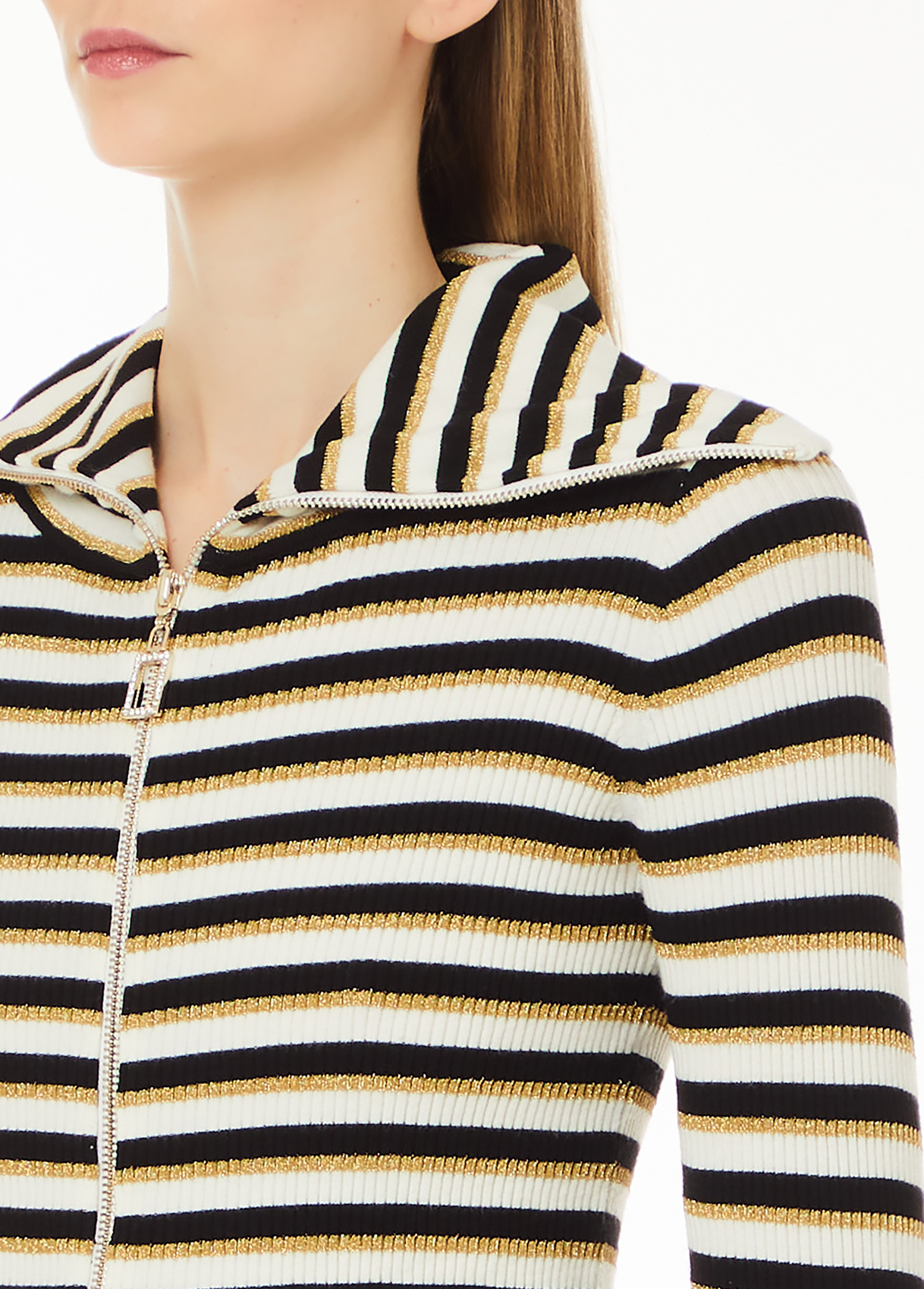 Viscose-blend knit cardigan Striped motif Lurex® inserts High-neck Long sleeves Decorative buttons Ribbed edges Zip-pull with logo Double tab zip closure “Liu Jo Better” Product