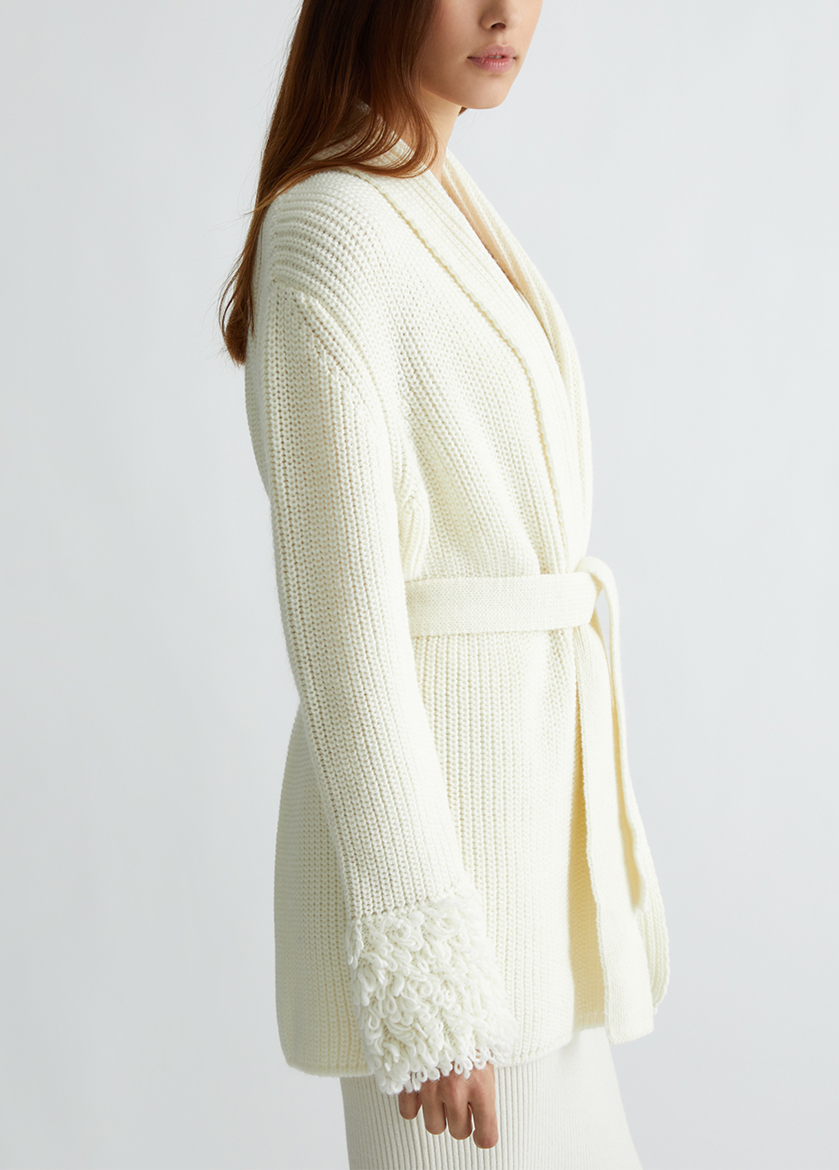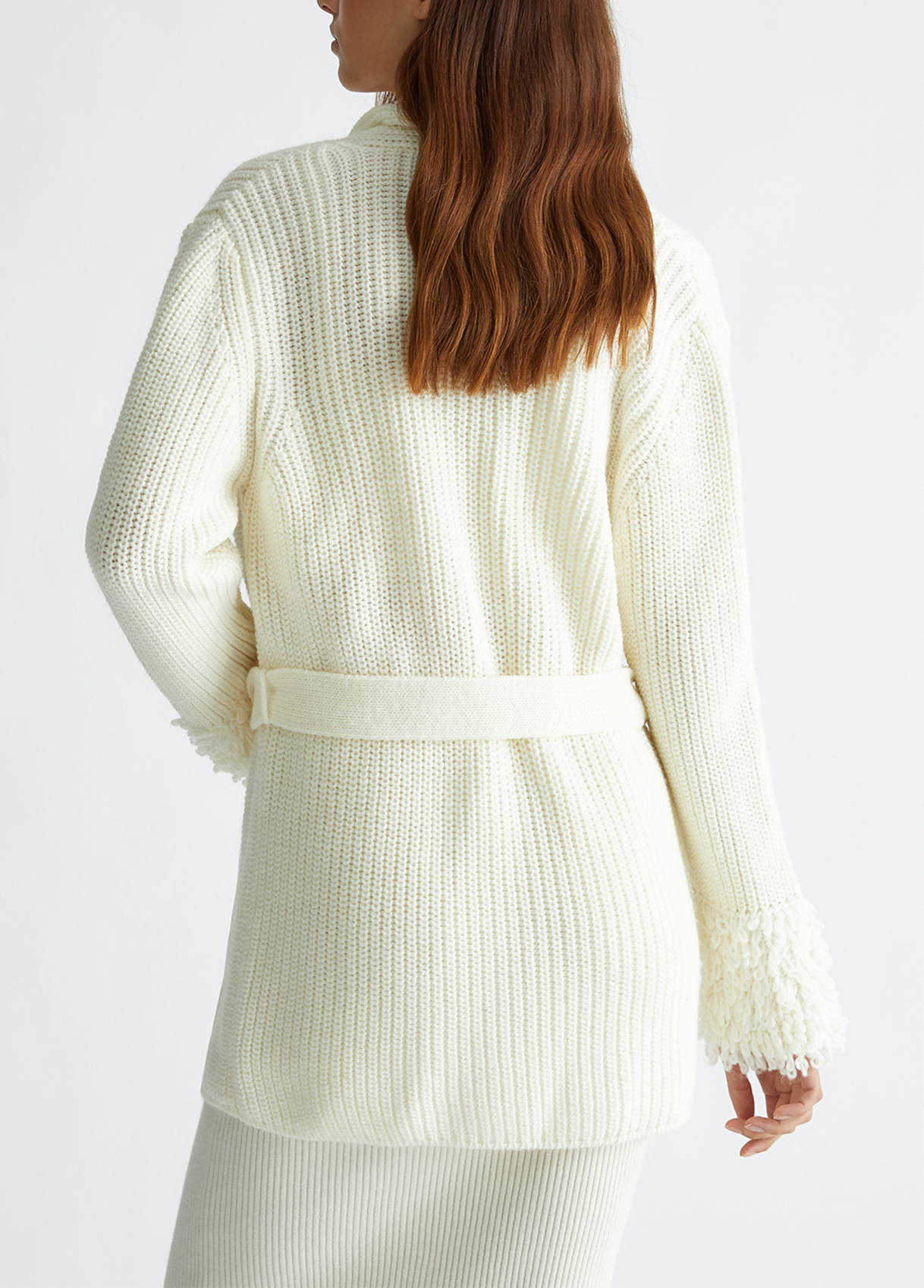 Wool blend cardigan Fur stitch details on the cuffs Tone-on-tone belt