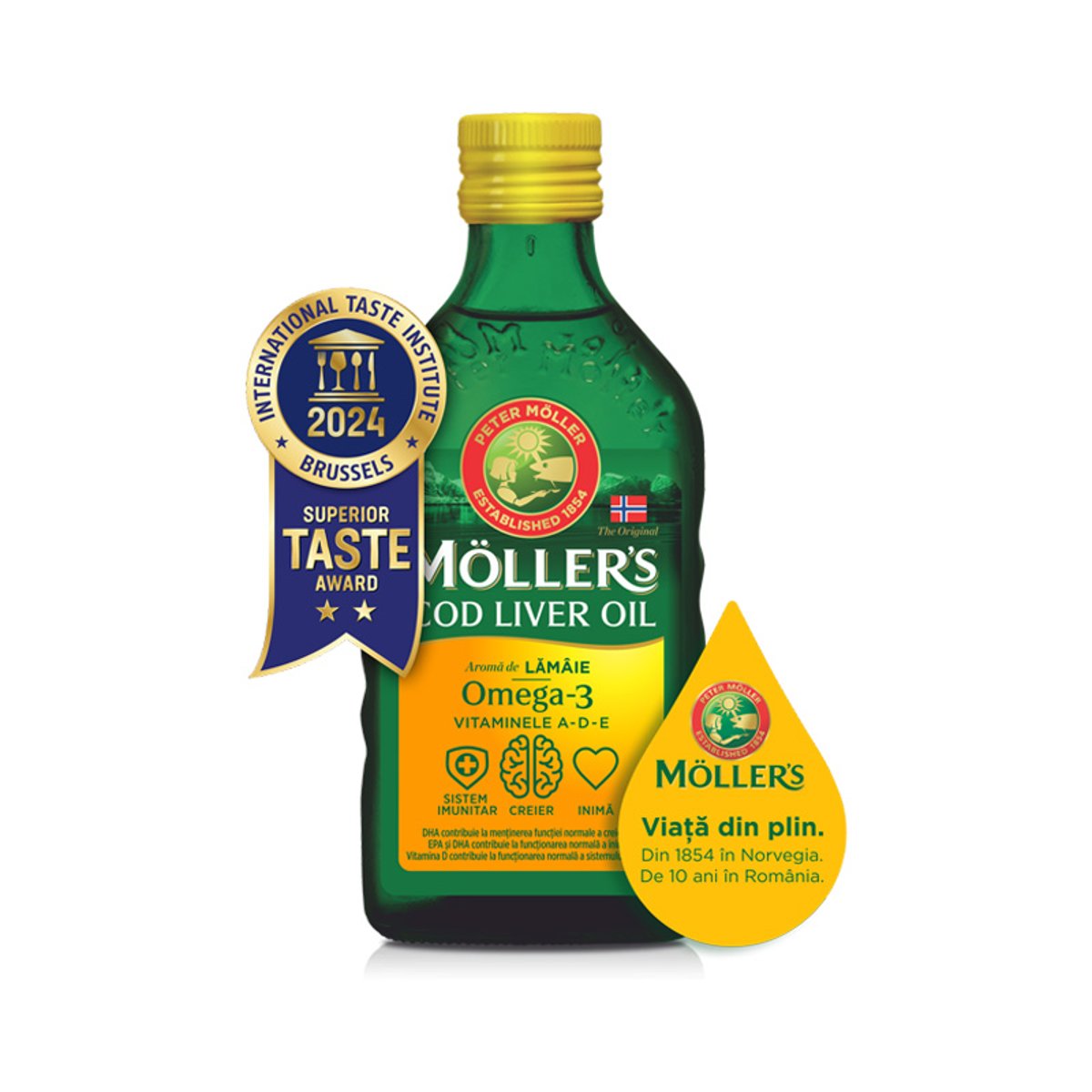 Mollers este uleiul de ficat de cod norvegian original, brevetat de farmacistul Peter Moller in 1854, contribuind la mentinerea sanatatii generatii de-a randul. Mollers Cod Liver Oil, este sursa naturala de Omega-3 provenit din cod salbatic, capturat responsabil din cele mai pure ape reci arctice norvegiene la Lofoten si Vester?len. Ajuta la mentinerea sanatatii! 1 lingurita (5 ml) de ulei de ficat de cod MOLLER?S cu aroma de lamaie contine 1,2 g acizi grasi naturali Omega-3 din peste (DHA + EPA) si vitaminele A, D (400 UI) si E. Pentru copii de peste 11 ani si adulti se recomanda 10ml/zi, asigurand 2,4 g (2400 mg) acizi grasi naturali Omega-3 din peste (DHA + EPA) si vitaminele A, D (800 UI) si E. EPA si DHA contribuie la functionarea normala a inimii*. DHA contribuie la mentinerea vederii normale si a functiei normale a creierului**. Vitamina D contribuie la functionarea normala a sistemului imunitar si la mentinerea sanatatii sistemului osos si a dintilor. Vitamina A contribuie la functionarea normala a inimii si a sistemului imunitar, la mentinerea vederii normale si la mentinerea sanatatii pielii si a membranelor mucoase Vitamina E contribuie la protejarea celulelor impotriva stresului oxidativ. Pentru o dezvoltare completa, fiecare picatura conteaza! Uleiul de ficat de cod Mollers contine in special DHA. Este dovedit clinic ca DHA contribuie la dezvoltarea cerebrala normala si a vederii. Vitamina D ajuta la absorbtia si utilizarea normala a calciului, contribuind astfel la mentinerea unui sistem osos normal. * efectul benefic se obtine in conditiile unui consum zilnic de 250 mg EPA si DHA ** efectul benefic se obtine in conditiile unui consum zilnic de 250 mg DHA Doze si mod de administrare Copii: 5 ml/zi Copii de peste 11 ani si adulti: 10 ml/zi Conform recomandarii producatorului, uleiul de ficat de cod se poate folosi in siguranta in timpul sarcinii si al alaptarii. Compozitie/5 ml. Ulei de ficat de cod 4.6 g Acizi grasi Omega-3 1.2 g - DHA (acid docosahexaenoic) 0.5 g - EPA (acid eicosapentaenoic) 0.4 g Vitamina D 10 ?g - 400 UI (200%*) Vitamina A 250 ?g ? 833 UI (31%*) Vitamina E 3 mg ? 3,3 UI (25%*) *Valoare Nutritionala de Referinta conform Regulament 1169/2011 Dupa deschidere, a se pastra la frigider si a se consuma in maximum 3 luni.