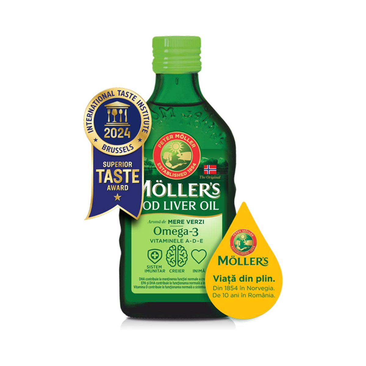 Moller?s este uleiul de ficat de cod norvegian original, brevetat de farmacistul Peter Moller in 1854, contribuind la mentinerea sanatatii generatii de-a randul. Moller?s Cod Liver Oil, este sursa naturala de Omega-3 provenit din cod salbatic, capturat responsabil din cele mai pure ape reci arctice norvegiene la Lofoten si Vester?len. Ajuta la mentinerea sanatatii! 1 lingurita (5 ml) de ulei de ficat de cod MOLLER?S cu aroma de mere verzi contine 1,2 g acizi grasi naturali Omega-3 din peste (DHA + EPA) si vitaminele A, D (400 UI) si E. Pentru copii de peste 11 ani si adulti se recomanda 10ml/zi, asigurand 2,4 g (2400 mg) acizi grasi naturali Omega-3 din peste (DHA + EPA) si vitaminele A, D (800 UI) si E. EPA si DHA contribuie la functionarea normala a inimii*. DHA contribuie la mentinerea vederii normale si a functiei normale a creierului**. Vitamina D contribuie la functionarea normala a sistemului imunitar si la mentinerea sanatatii sistemului osos si a dintilor. Vitamina A contribuie la functionarea normala a inimii si a sistemului imunitar, la mentinerea vederii normale si la mentinerea sanatatii pielii si a membranelor mucoase Vitamina E contribuie la protejarea celulelor impotriva stresului oxidativ. Pentru o dezvoltare completa, fiecare picatura conteaza! Uleiul de ficat de cod Moller?s contine in special DHA. Este dovedit clinic ca DHA contribuie la dezvoltarea cerebrala normala si a vederii. Vitamina D ajuta la absorbtia si utilizarea normala a calciului, contribuind astfel la mentinerea unui sistem osos normal. * efectul benefic se obtine in conditiile unui consum zilnic de 250 mg EPA si DHA ** efectul benefic se obtine in conditiile unui consum zilnic de 250 mg DHA Doze si mod de administrare Copii: 5 ml/zi Copii de peste 11 ani si adulti: 10 ml/zi Conform recomandarii producatorului, uleiul de ficat de cod se poate folosi in siguranta in timpul sarcinii si al alaptarii. Compozitie/5 ml. Ulei de ficat de cod 4.6 g Acizi grasi Omega-3 1.2 g - DHA (acid docosahexaenoic) 0.6 g - EPA (acid eicosapentaenoic) 0.4 g Vitamina D 10 ?g - 400 UI (200%*) Vitamina A 250 ?g ? 833 UI (31%*) Vitamina E 3 mg ? 3,3 UI (25%*) *Valoare Nutritionala de Referinta conform Regulament 1169/2011 Dupa deschidere, a se pastra la frigider si a se consuma in maximum 3 luni.