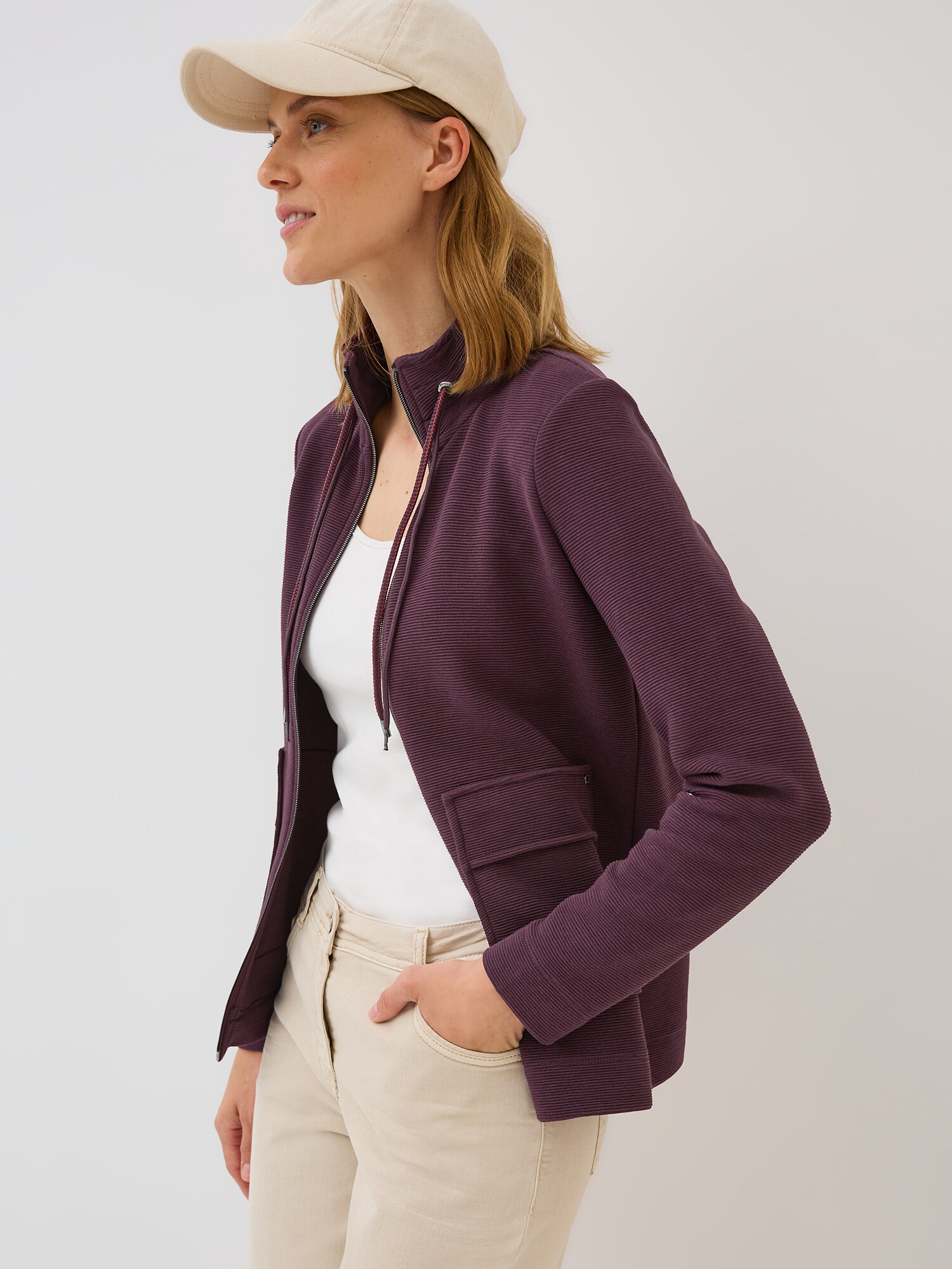Design: Cu bandă/ șiret, Manșete cu striații, Buzunare aplicate; Tip de închidere: Fermoar; Căptușeală: Necăptușit; Material: Material sweat; Decolteu: Guler tunică; Imprimeu: Monocrom; Detalii: Tiv cu șiret, Suprafață structurată, Material moale; Croi: Croi normal; Lungime mâneci: Mâncecă lungă; Lungime: Lungime normală