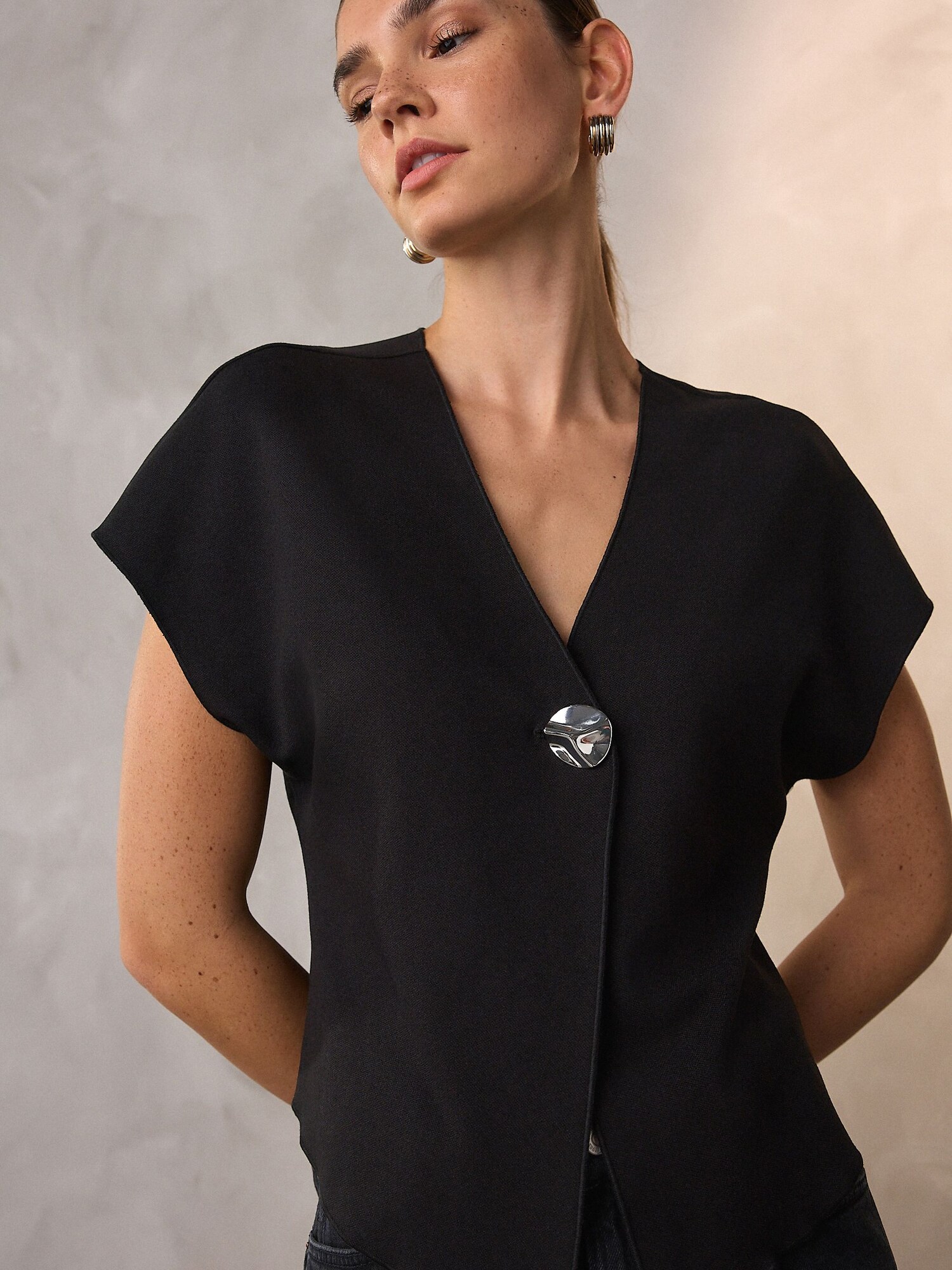 Design: Mâneci tăiate, Decolteu adânc; Tip de închidere: Închidere cu nasturi; Material: Tricot; Decolteu: Decolteu în V; Imprimeu: Monocrom; Detalii: Material moale; Croi: Croi normal; Lungime mâneci: Mâneci scurte; Lungime: Lungime normală