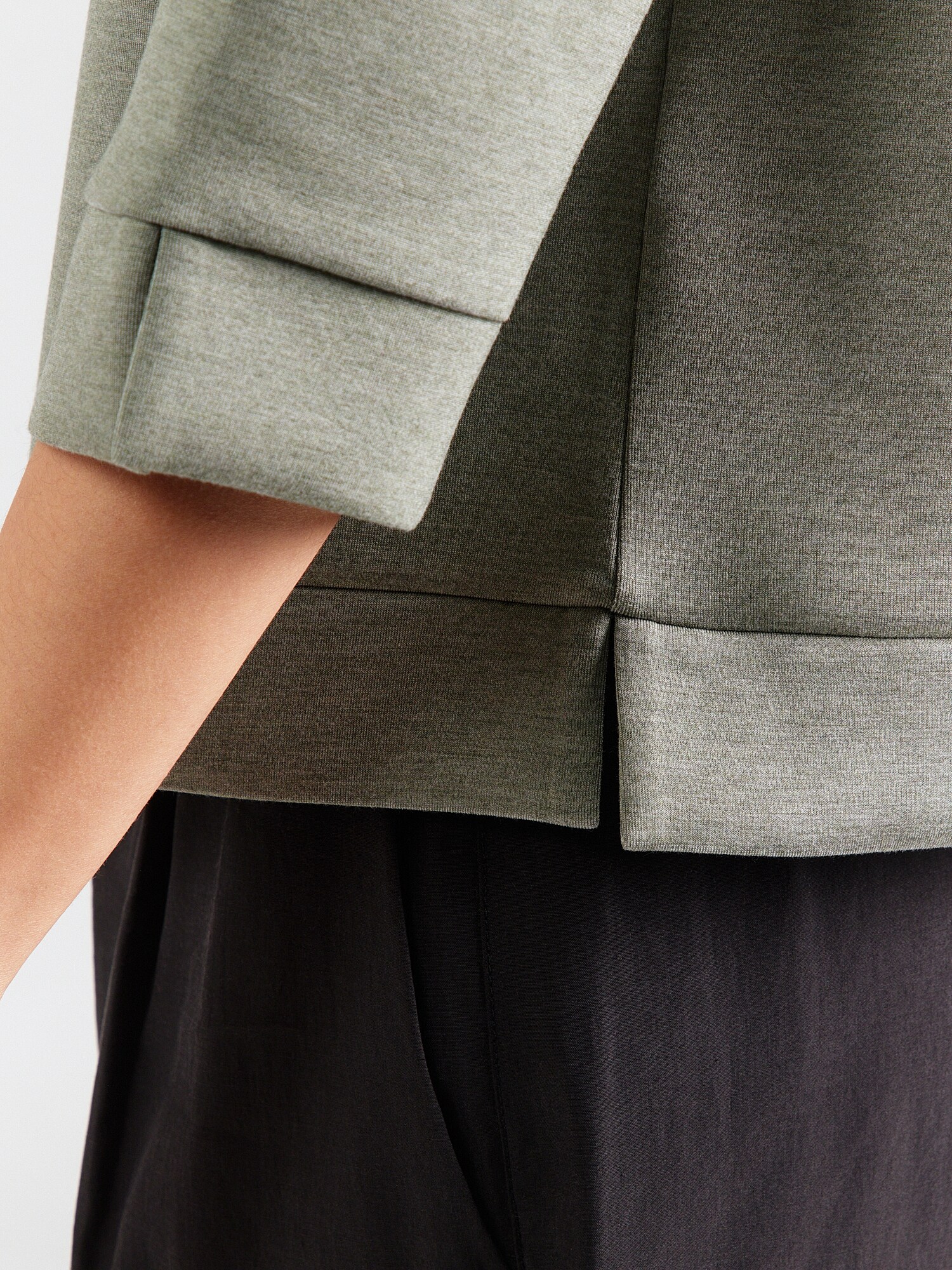 Design: Tiv drept, Șliț lateral, Umăr întretăiat; Material: Material sweat; Decolteu: Guler tunică; Imprimeu: Melanj; Detalii: Cusături ton în ton, Material moale; Croi: Croi lejer; Lungime mâneci: Mâneca trei sferturi; Lungime: Lungime normală