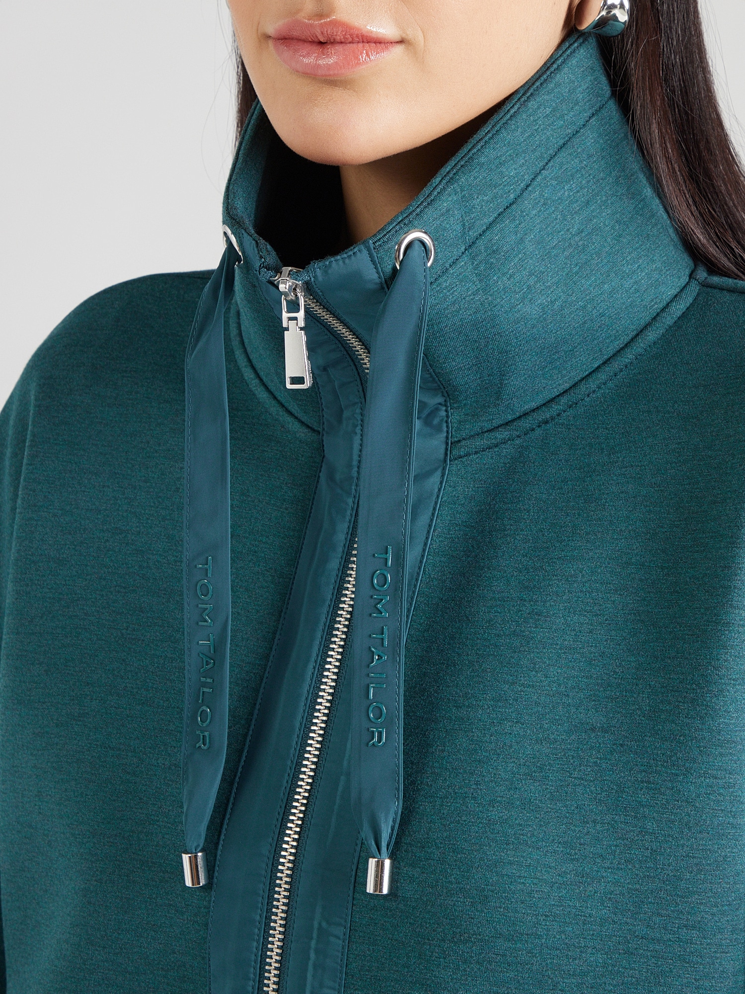 Design: Cu bandă/ șiret, Umăr întretăiat, Buzunare laterale deschise; Tip de închidere: Fermoar; Material: Material sweat; Decolteu: Guler tunică; Imprimeu: Monocrom; Detalii: Cusături ton în ton, Material moale; Croi: Croi lejer; Lungime mâneci: Mâncecă lungă; Lungime: Lungime normală