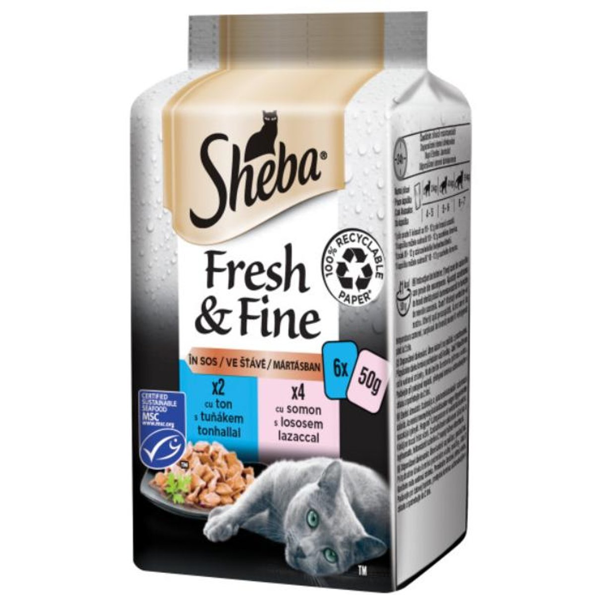 Cu gama de hrana pentru pisici SHEBA(r) Fresh & Fine este usor sa ii oferiti pisicii dvs. gusturile pe care le adora intr-o combinatie fina de bucati delicate, asigurand un regim alimentar complet companionului dvs. felin. Preparate din ingrediente selectate fara coloranti sau conservanti artificiali, un mod minunat de a va aduce pe dvs. si pe prietenul dvs. felin mai aproape, la ora meselor. Disponibil in pliculete de hrana de 50g pentru pisici. Potrivite pentru toate pisicile cu varsta de peste 12 luni – adulte si senioare. Pastrati de fiecare data interesul prietenului dvs. felin cu bucati taiate delicat, servite in sosul fin al hranei pentru pisici Sheba. Mereu o servire ideala pentru un gust proaspat la fiecare masa. Toate retetele de hrana umeda pentru pisici Sheba au fost dezvoltate impreuna cu nutritionistii si veterinarii nostri de la CENTRUL WALTHAM PENTRU NUTRITIA ANIMALELOR DE COMPANIE, avand garantia unei nutritii 100% complete si echilibrateA se pastra inchis, la loc uscat si racoros. Temperatura camerei.